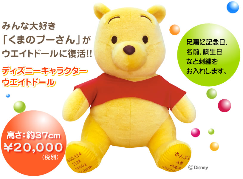 そんな「くまのプーさん」が、生まれた時の体重と同じ重さのぬいぐるみとして変身します。ウエイトベアスタジオでは、ディズニーウエイトドールの仲間として、再登場!