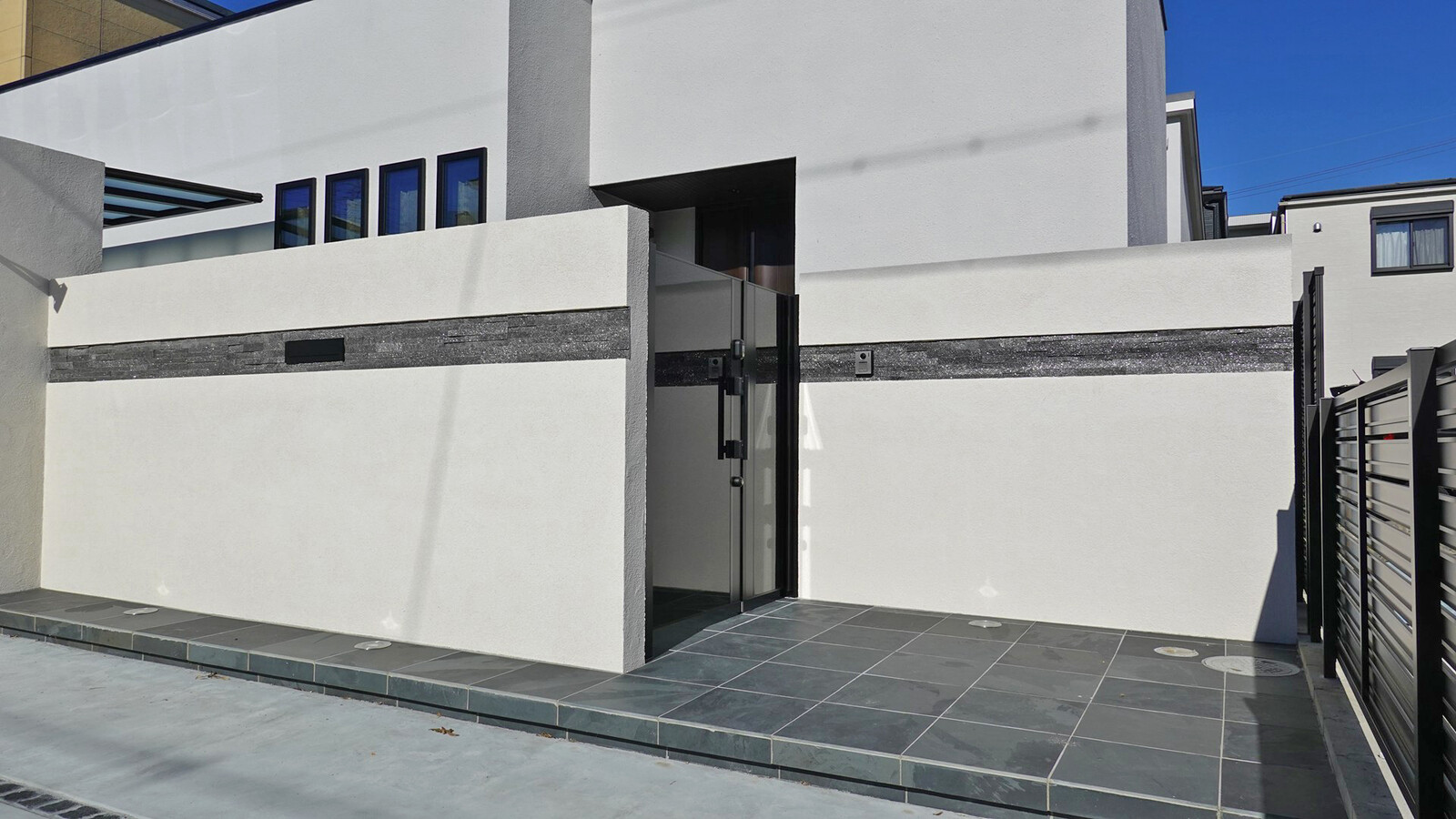名古屋市守山区 シュールでシンプルな意匠の平屋のクローズ外構です。 Date : 2024年11月24日 Category : クローズ外構 , スマートなエクステリア <> 住友林業の平屋の建物のクローズ外構が完成しました。シンプルながら、しっかりと存在感を出したエクステリアです。 お客様のご要望もあり、植栽もないスーパーシンプルな外観です。スクエアスタイルの建物の意匠性を尊重したクールなフォルムで造らせていただきました。周囲とは一線を画したエクステリアになっています。 シャッターはエンジン始動と共に自動で開くオート設定、帰宅時にも自動で開きます。門扉は近づくと解錠するノータッチキー。フルクローズな外構ですが、極力、ストレスを感じない仕様になっています。 「クローズ外構」カテゴリの最新記事 「スマートなエクステリア」カテゴリの最新記事 コメント コメントフォーム 名前 コメント 記事の評価 リセット リセット 顔 星 情報を記憶 コメントを投稿する