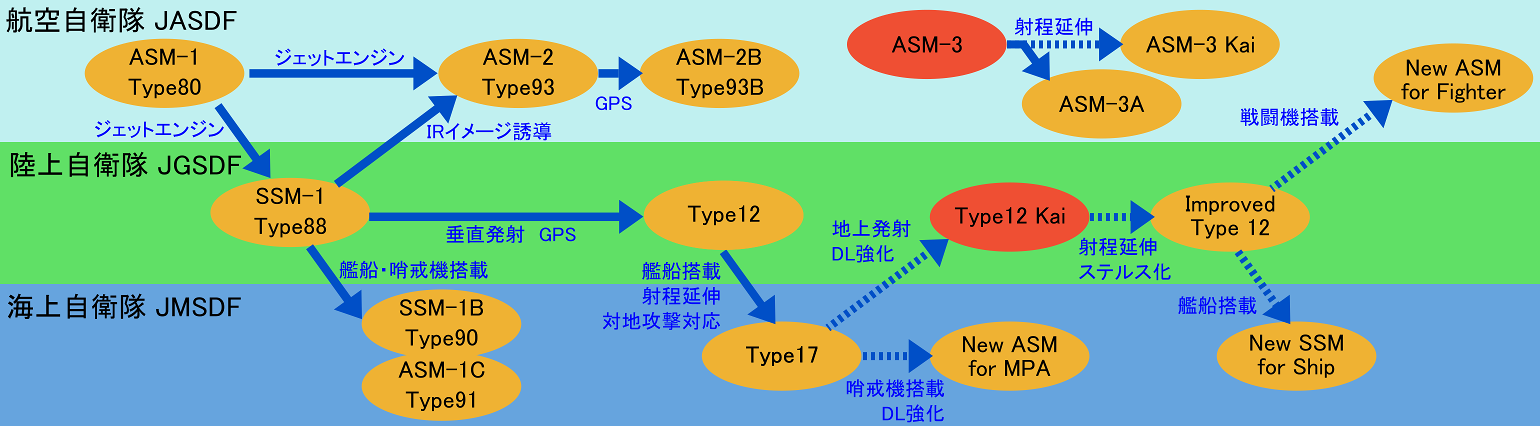 - 上記『17式地対艦誘導弾』の改良型地上版『12式地対艦誘導弾(改)』と哨戒機版『新哨戒機用空対艦誘導弾』の開発