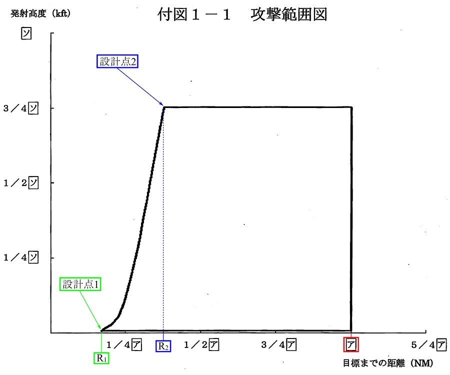 | 2 | 性能・諸元 | (1)攻撃範囲 | 最大射程は[ア]NM以上とし、付図1-1で示された攻撃範囲以上とする。 | 最大射程は低高度発射、高空巡航、終末シースキムで規定する。 |