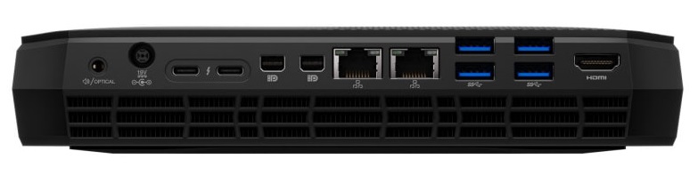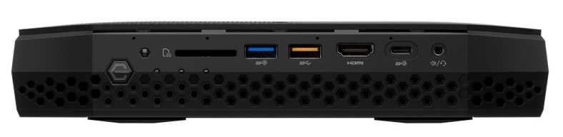 「NUC8i7HVK」と「NUC8i7HNK」ではフロントにVR HMDの接続を意識してUSB3.0とHDMIポートが用意されているなど、フロントとリアに実装されたI/Oポートが非常に充実しています。フロントには左から、SDカードスロット、USB3.0 Type-C*2、HDMI、USB3.1 Type-C、ヘッドホン・マイク兼用3.5mmジャック、背面には左から、光学オーディオ出力、DC端子、Thunderbolt3*2、MiniDIsplayPort*2、有線LAN*2、USB3.0 Type-A*4、HDMIが実装されています。
