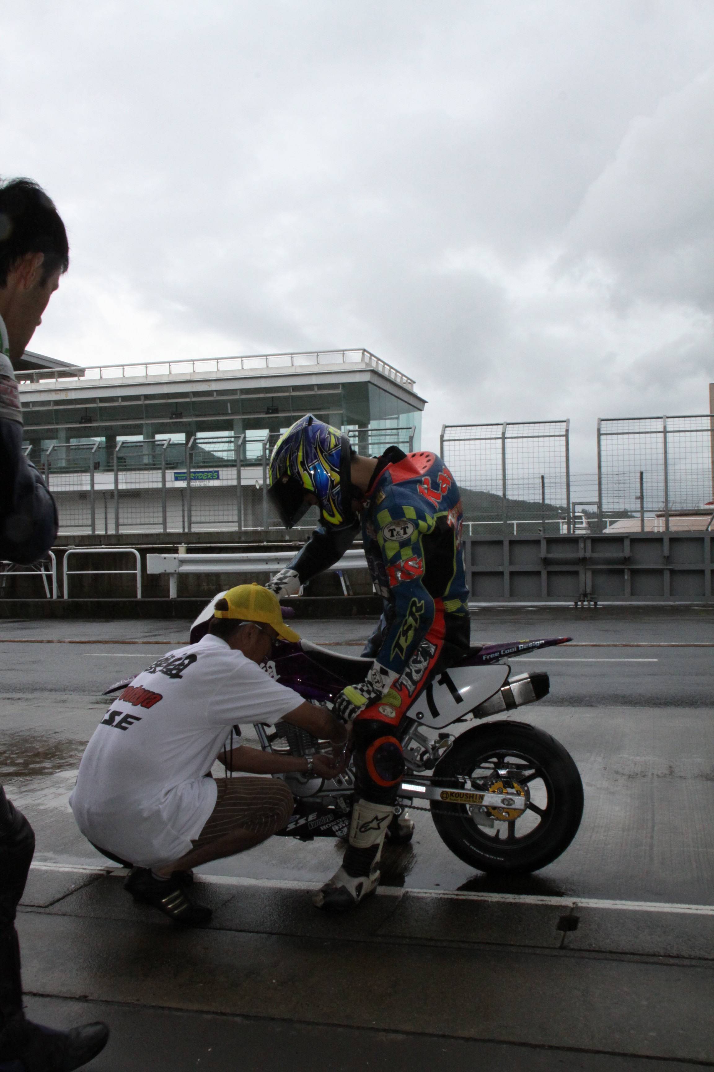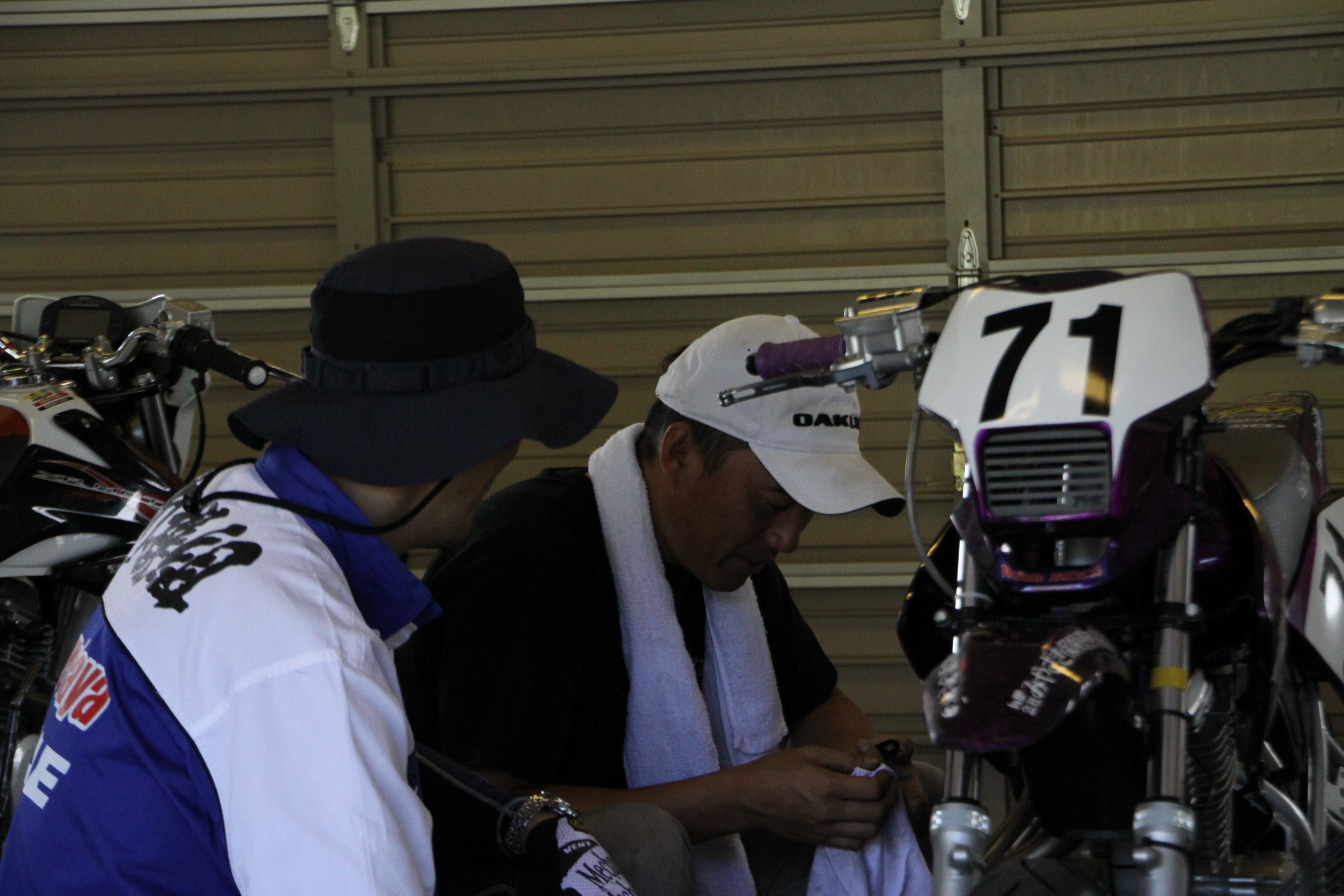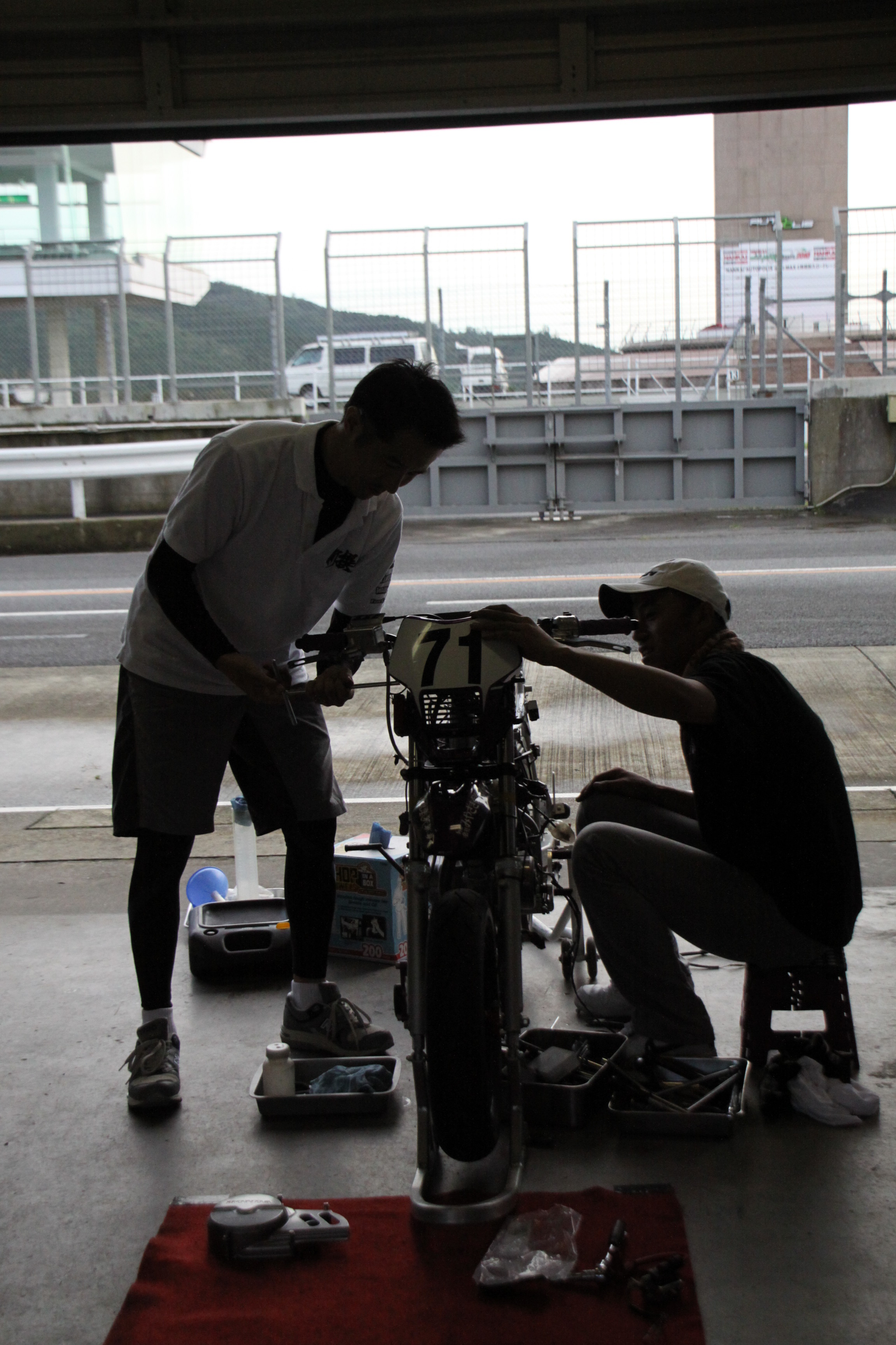 結局、予選アタック的に一番有利なライダーを僅か1周しか走らせず予選結果17位。。。翌日の決勝に不穏な空気立ち込めるPITの中で「クロちゃん」に励まされながらの作業