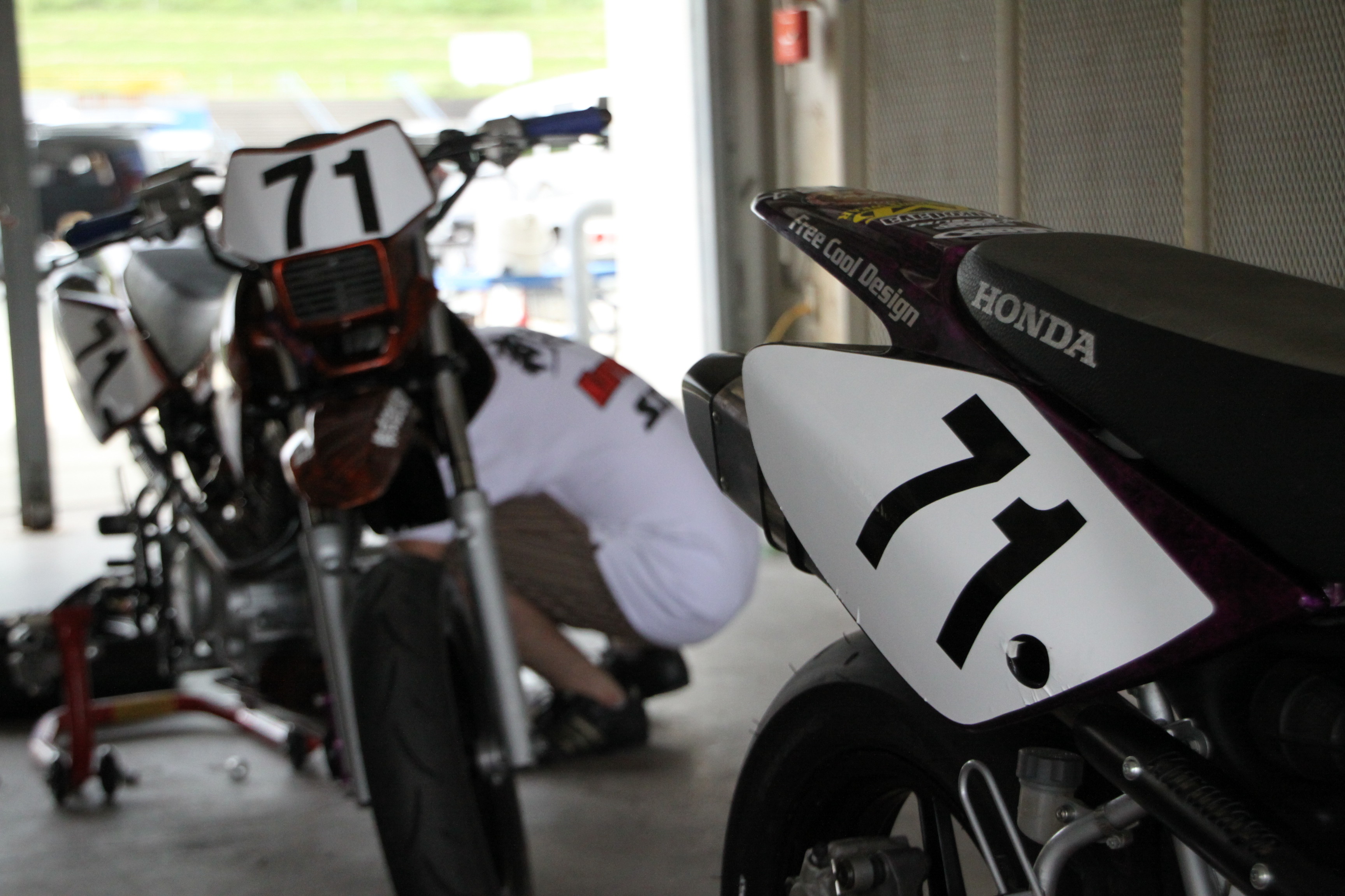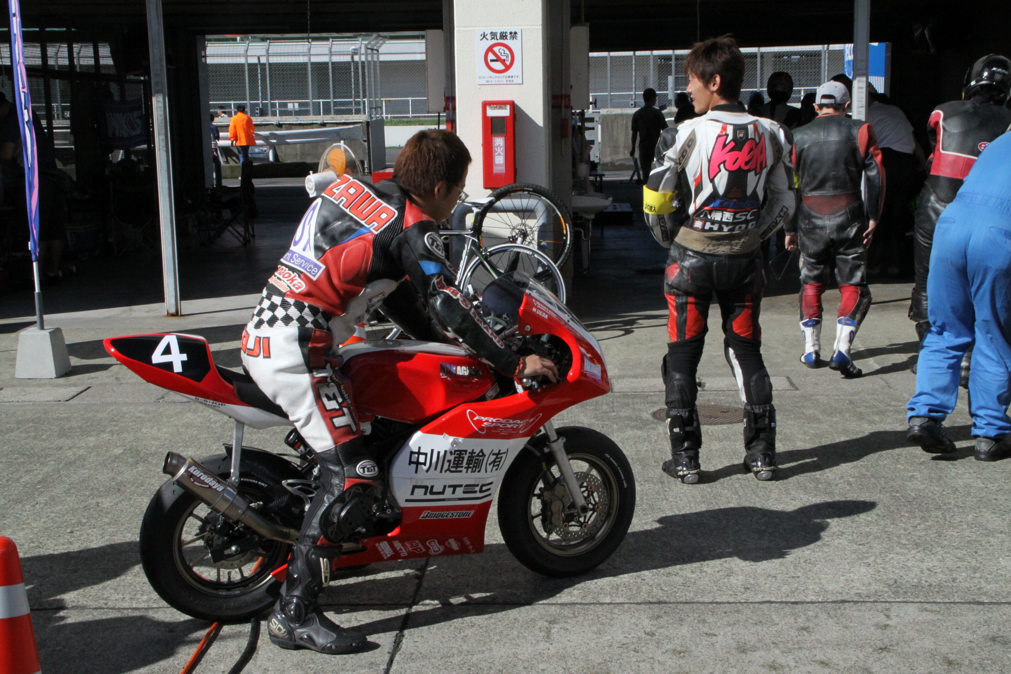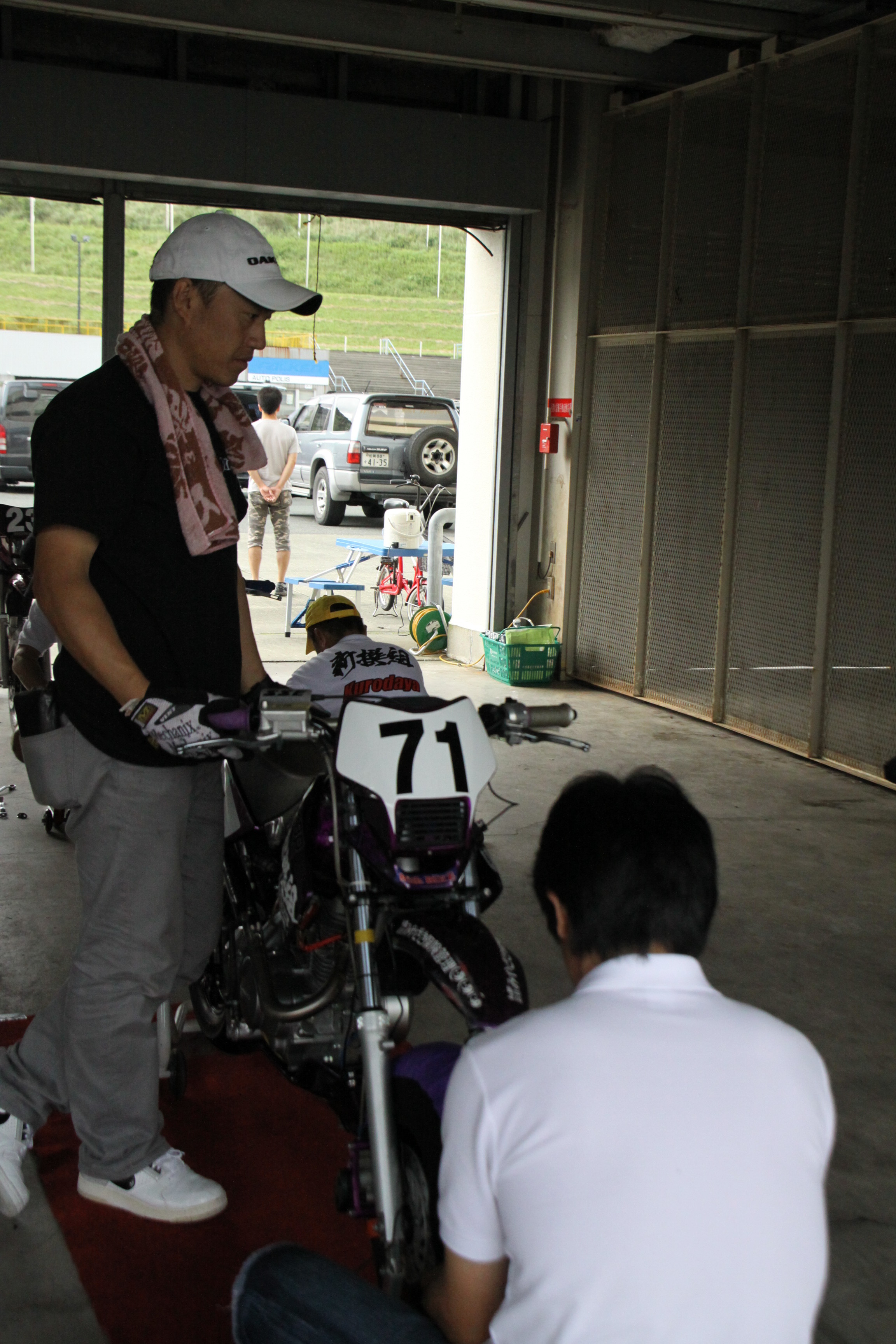 ホームストレートの伸びに若干不満のあった「クロちゃん」の作戦でマフラー交換です。テキパキと作業は進み、規程時間内に作業終了、Bros弟にライダーチェンジ