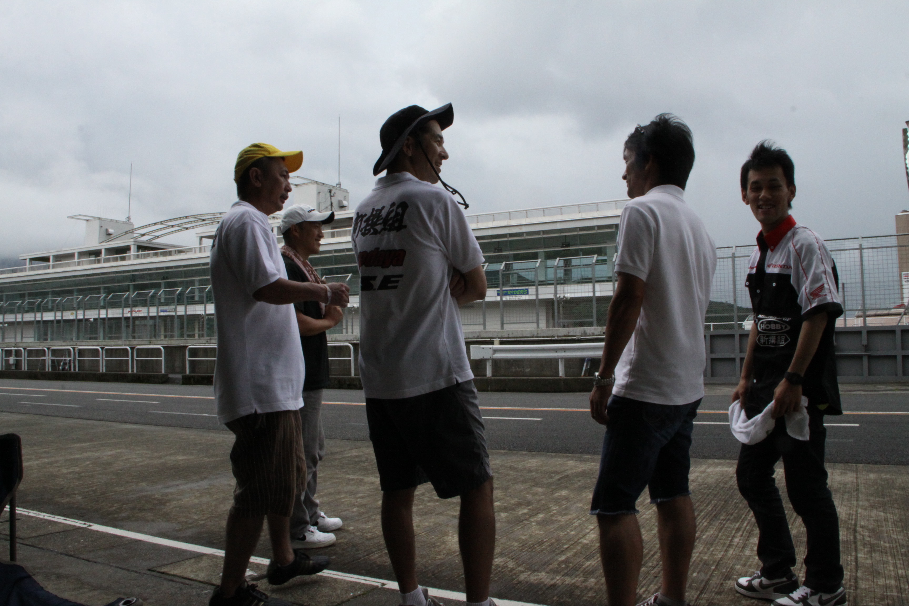 OPENクラスが激しいレースを展開する中、我々のPITではクロちゃんを始めとするスタッフによるミーティングが行われていました。ワタシとクロちゃんとのミーティングとは言っても殆どが車両の作り方や仕上げ。。。随分ダメ出しされました
