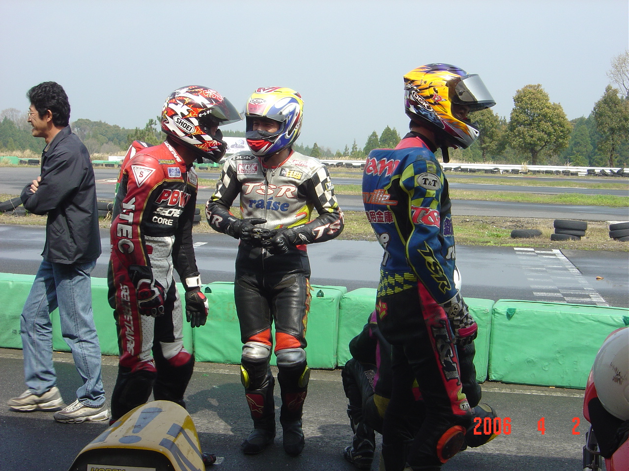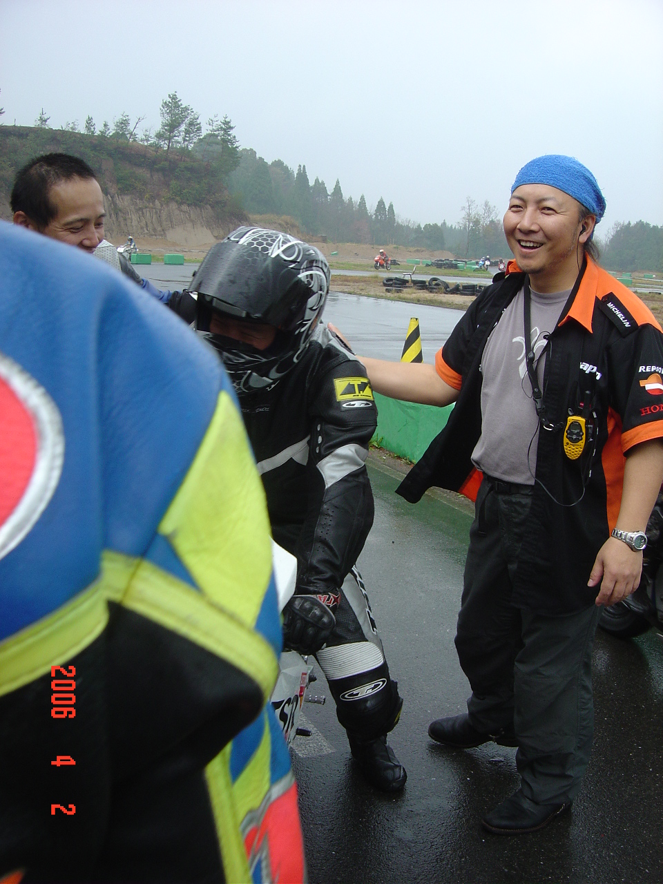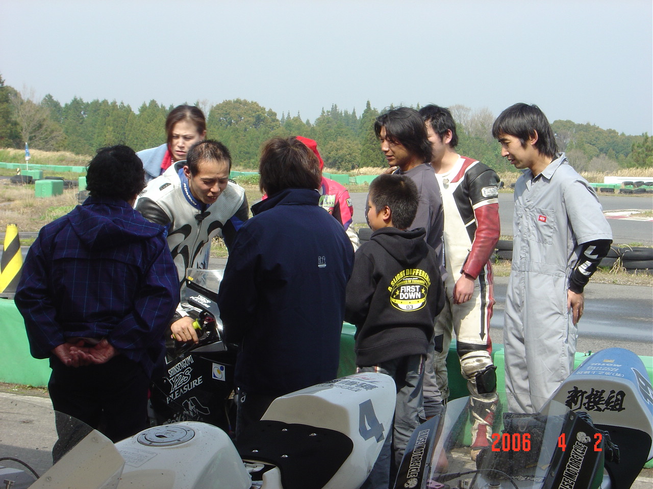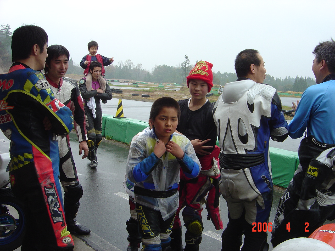 ワタシの影で一人屈んだライダーがいます。今回選択の余地なくドライタイヤを履くKボタくんです。多分、我々の話を聞きながらコースがみるみる乾くのをニヤニヤして見ていた事でしょう。「もう少し、もう少し。。。」と。