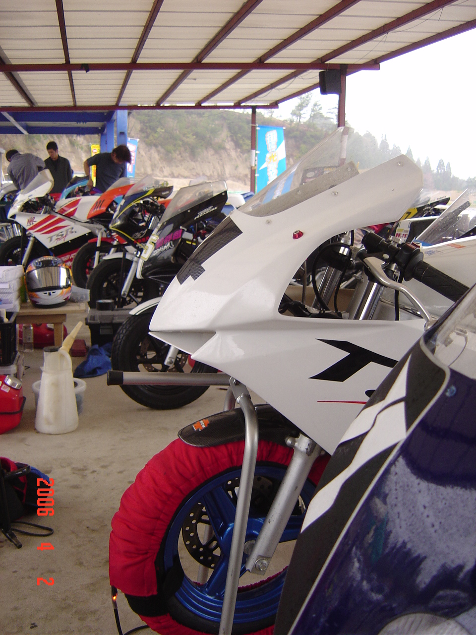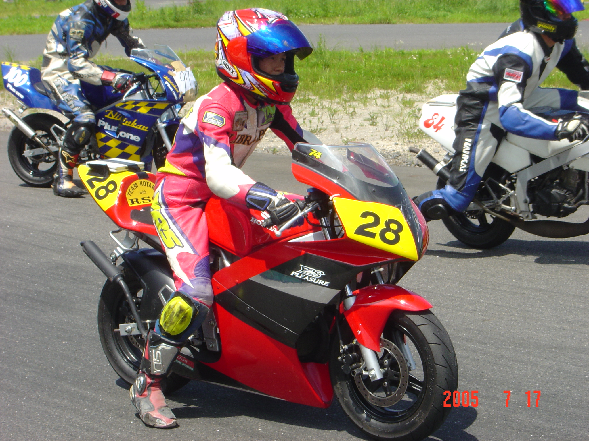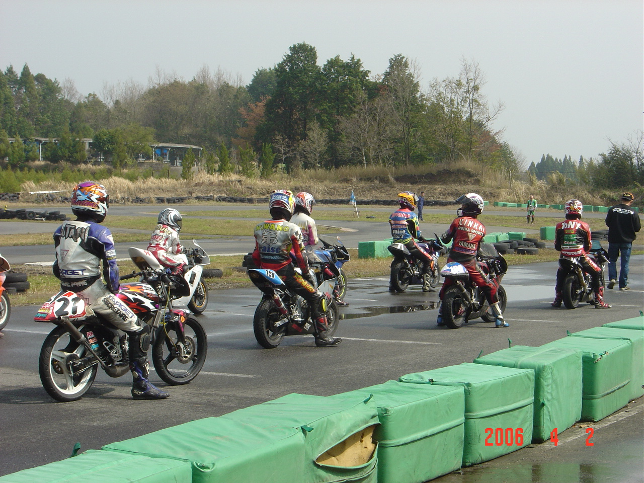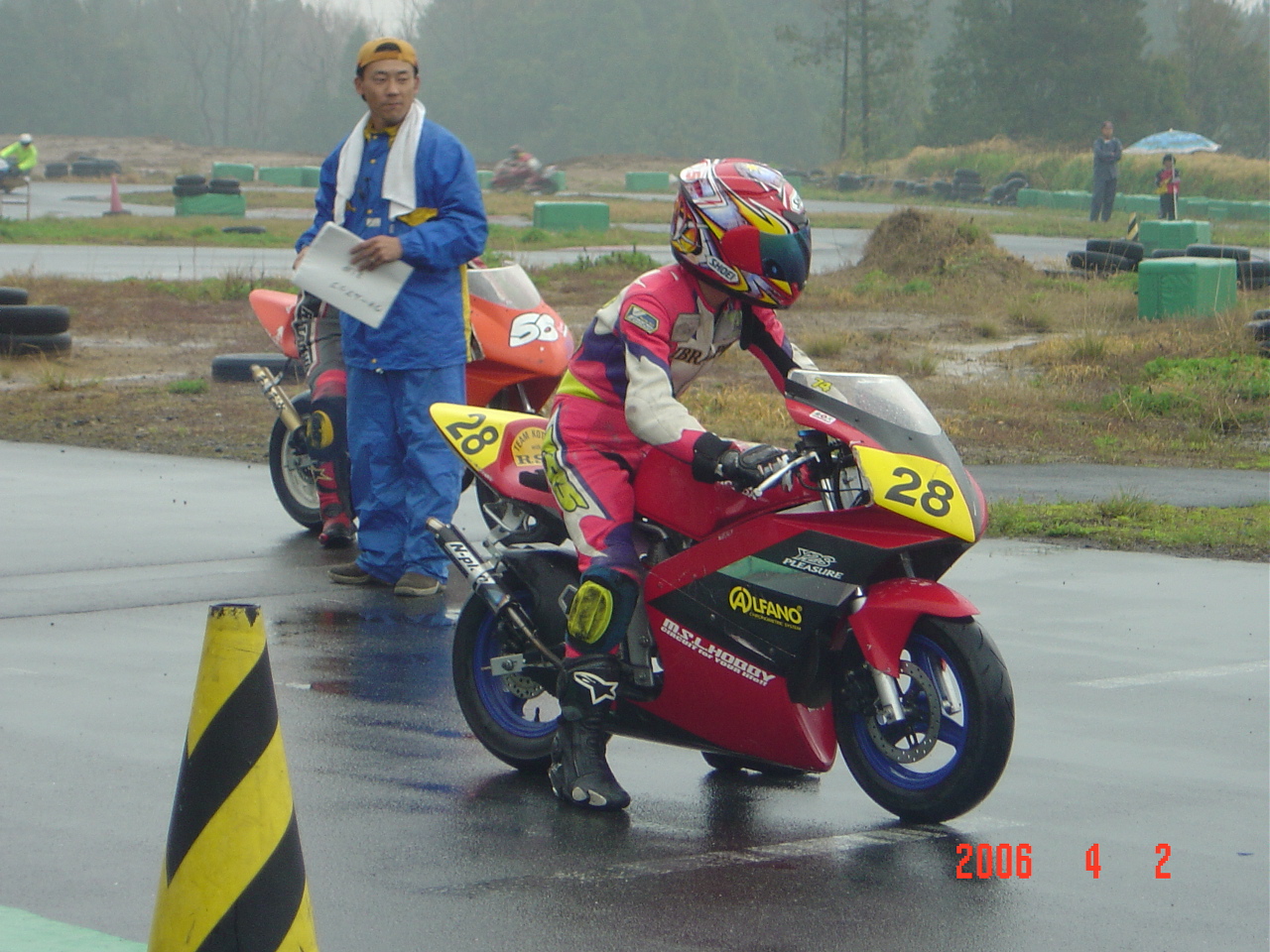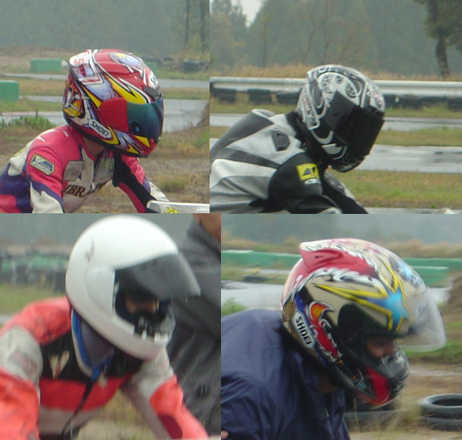 午後から少しずつアメの量が減り風も出てきた。なんとなく明るくなってきた感じもする。SPー50Jr、OPEN、レクレーションとスケジュールは進みいよいよSP−50EXP決勝。完全にアメは止み、路面も7割以上乾いている。おまけにオフィシャルが路面を履いて乾かそうとしている。「え〜ぇそりゃないよ!自然な状態にしていて〜」心の中で叫びました。(オフィシャルの皆さんゴメンナサイ)ワタシのバイクには前後レインタイヤ、今から換装するには時間もないし、新品タイヤの為皮むきもしていない。。。他にも弟、Aガタさん、Kカイくん、Sグチくんとレインを組んだライダーがいる。