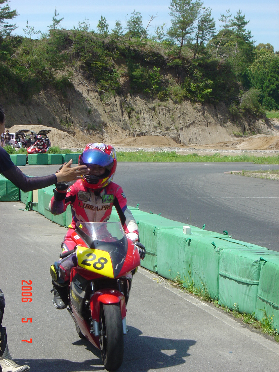 今回の全日本観戦でワタシが1番楽しみにしていたライダー(冨沢選手)です。125ccに参戦している彼は15歳の高校1年生。パドックやピットウォークの際に話しましたがとてもヒト慣れしていて、高1には見えません。(ここら辺に住む高校生とはエライ違いです。)特に子供が近付くと「ワーおいで、おいで〜!」って子供と写真撮ったりしてる姿はとても親しみやすく、変なスレがなくて好感が持てました。あっ! 好感が持てるといえば同じ125ccクラスに出場していた14歳、中上選手もさわやかでとても好感が持てました。こんなライダーは自然とガンバッテ欲しいな〜って思えてきます。