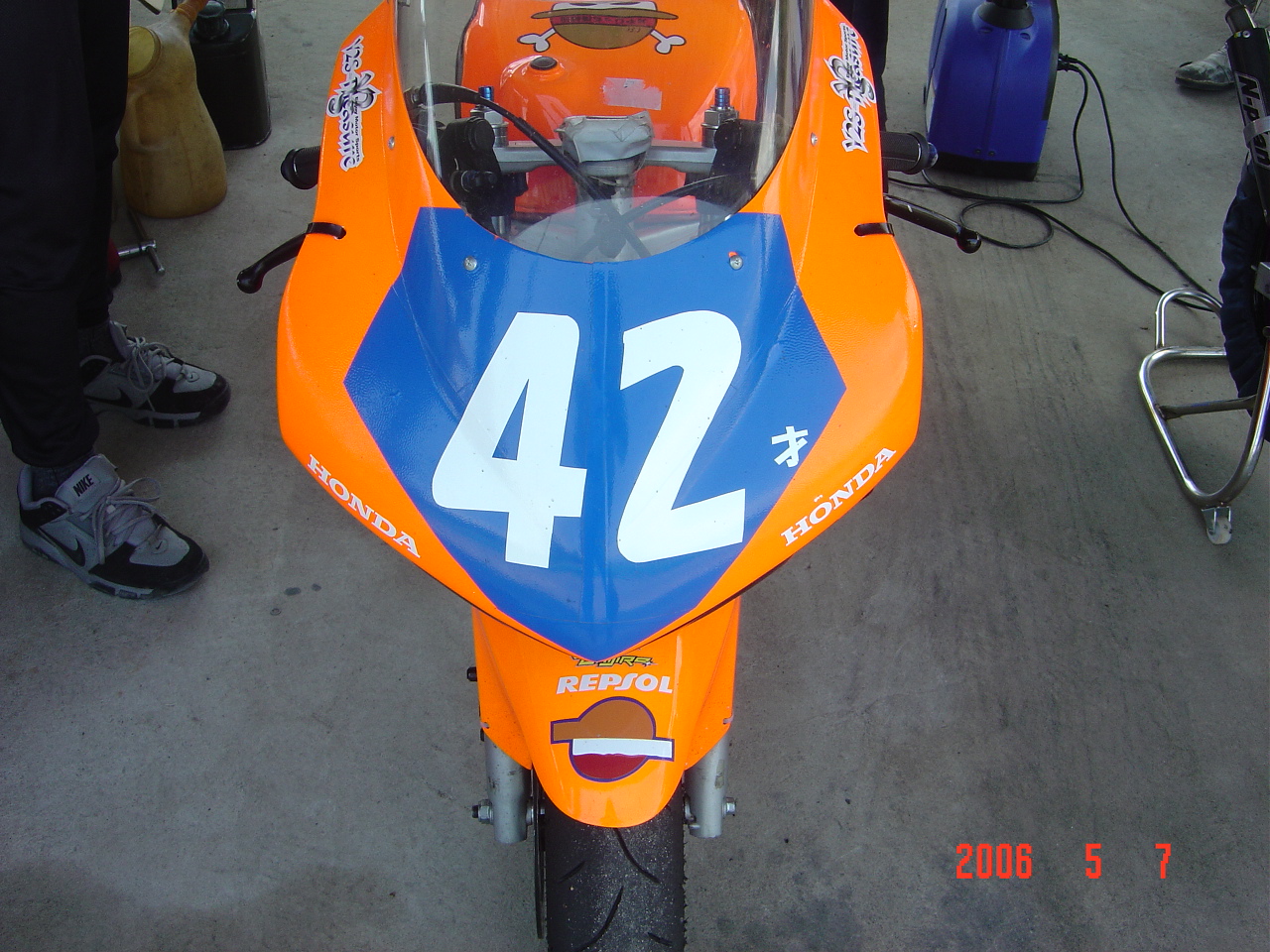 おやじっち海賊団団長のバイクです。42才と書いてあるように見えますがタダの#42だと信じています。久しぶりにHOBBYのレースに来てくれました。九州のロードコースではかなり名の知れたライダーなのですが、とても気さくでカッコつけないスタイルが沢山のライダーの信頼を得ています。もちろんワタシも大好きで尊敬出来るライダーの一人です。