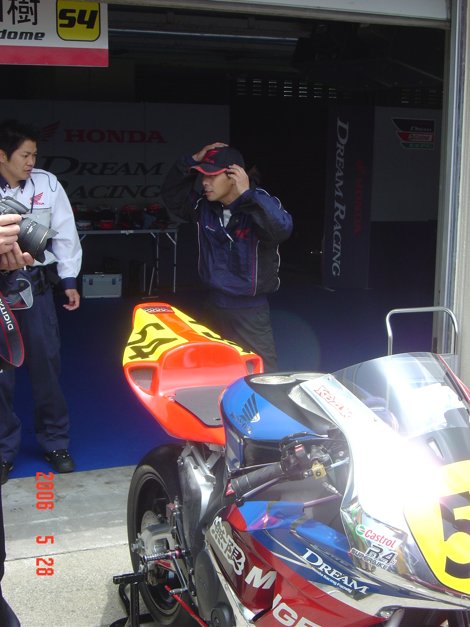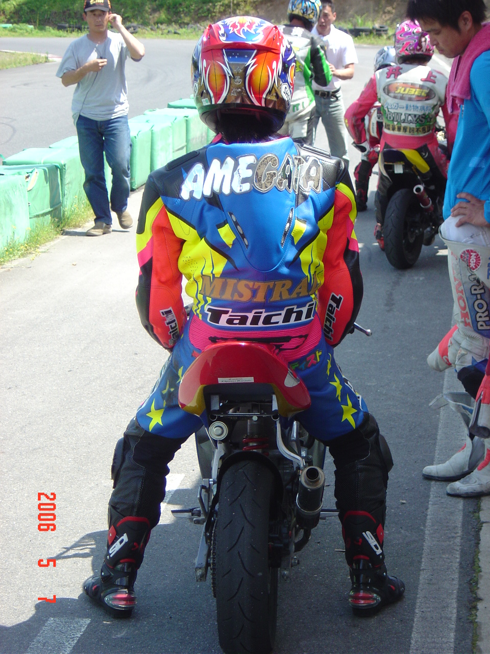 ピットウォークの際にライダーの後ろにいたmotopara7さんをバッチリ撮影しておきました。FRGPに参加の皆さん、スゴイおやじでしたよ彼は。