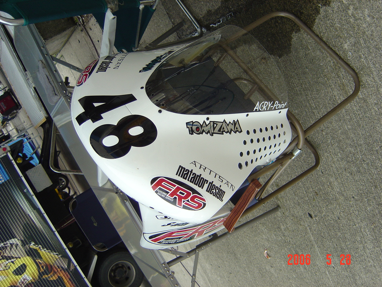 アッパーカウルに空けられた無数の穴、これはナンの為のモノだか知ってますか?この写真はAPで行われた全日本のパドックで撮ったモノです。この無数の穴は強風吹き荒れるAPで横風の抵抗を少しでも和らげる為に空けられたモノです。軽量級(125cc)の車両の多くがこの穴を採用していました。(朝のパドックではドリルを持ったメカニックが忙しくゴリゴリやってました)