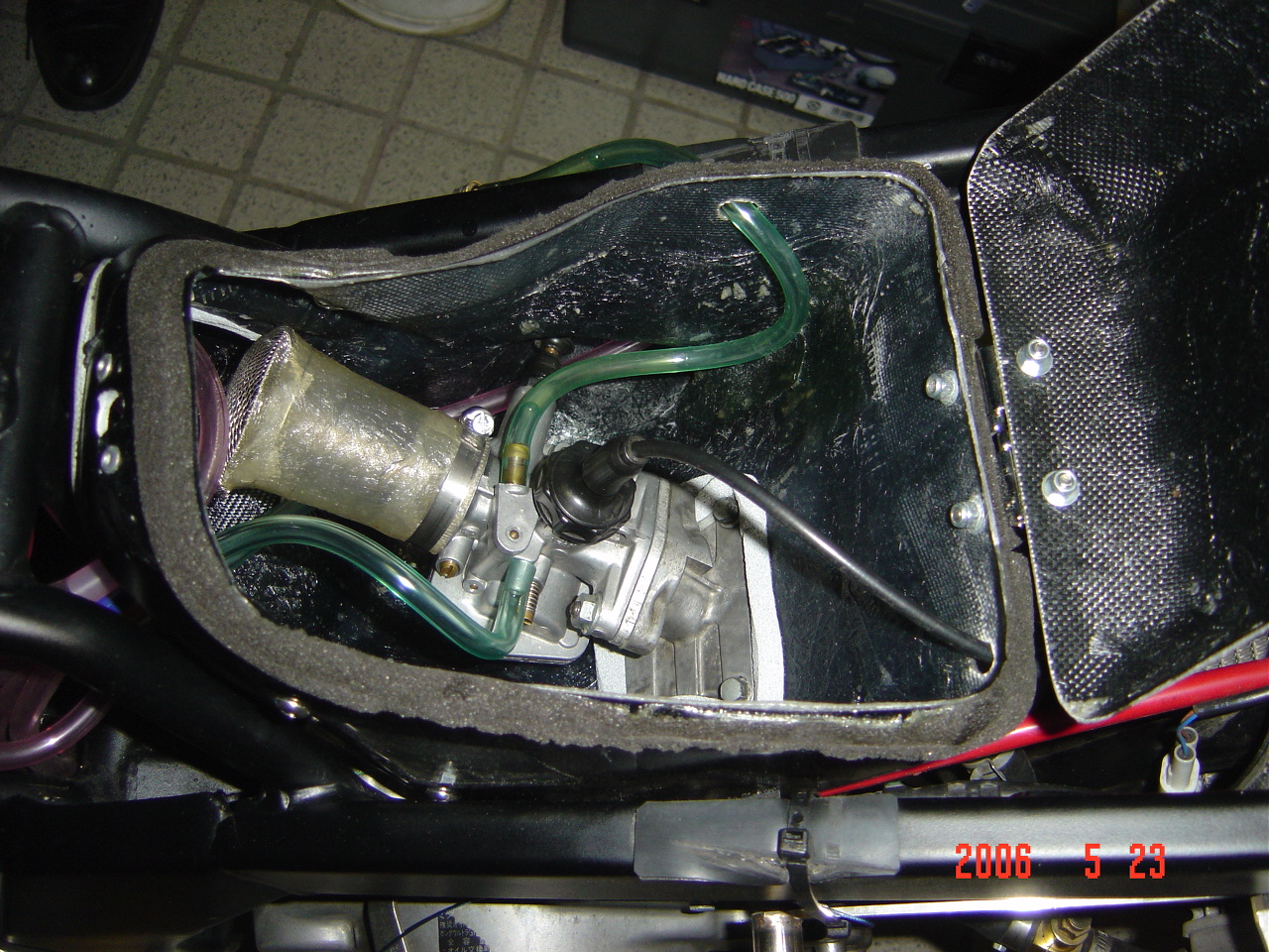 少々ガンバッテも減らない体重に何か良い秘策はないかと考え導入したのがこのラム圧キットです。ラム圧とは、バイクの走行風を利用してフレッシュエアーをダクトでキャブボックスに引き込み、加圧してキャブレターに多くの空気を送り込む、これでキャブレター内の流速が上がりパワーが上昇する仕組みです。(間違っていたらゴメンナサイ)キャブボックスは殆ど密閉状態ですから多少整備性は落ちます。