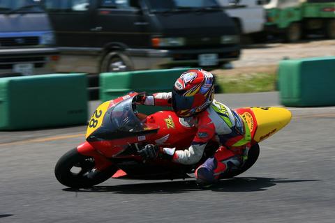 予選失敗、オマケにスタートも失敗し14番目位に落ちたでしょうか?必死に前のライダーを抜こうとプッシュしているうちに熱くなりすぎて、ヘアピン進入で前車に追突しそうになりました。「マズイ!」と思いリヤブレーキを強く踏みすぎリヤからスリップダウン。。。。目の前を自分のバイクが滑って行く様子がスローモーションになって写りました。