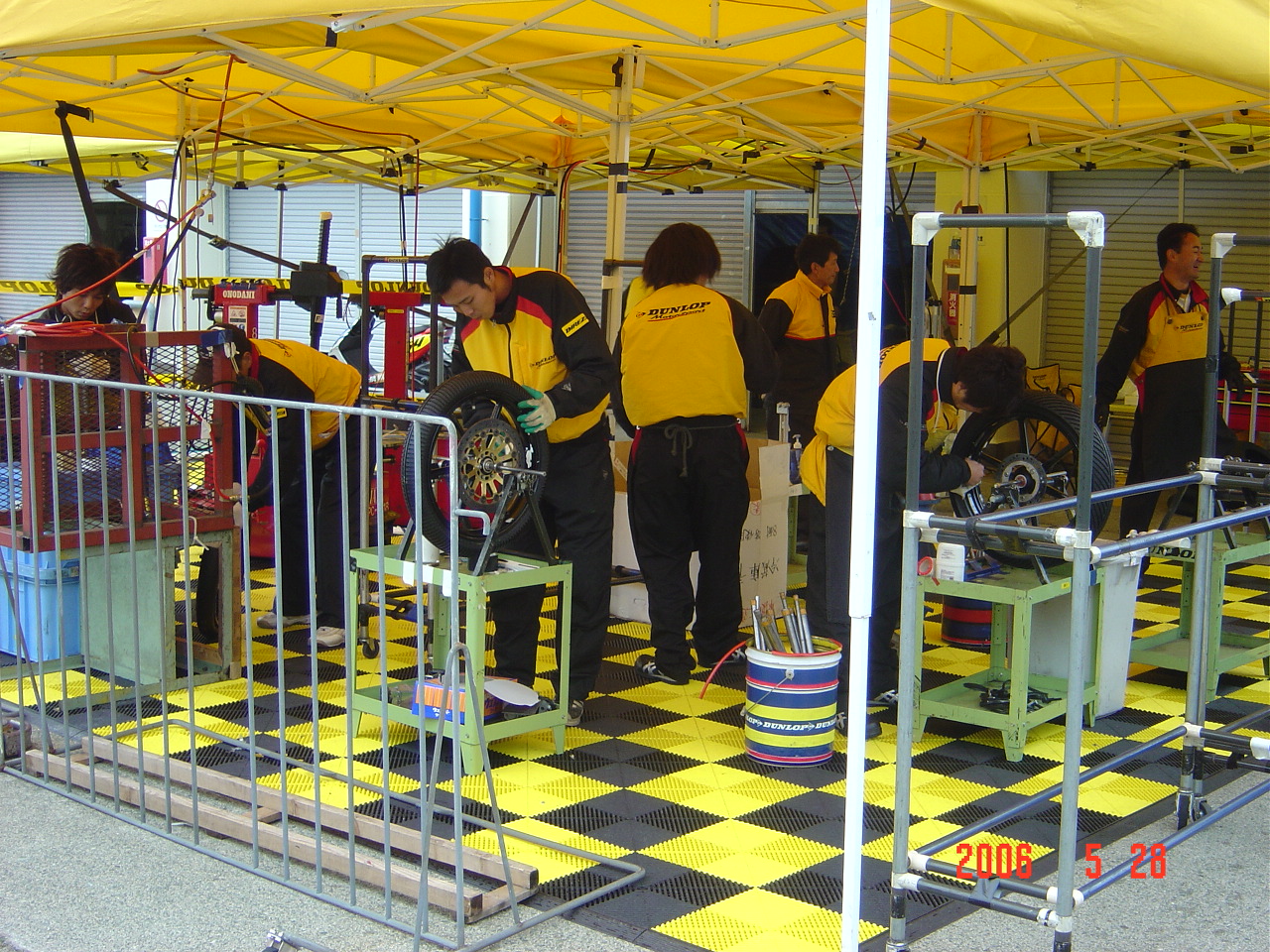 先日APで行われた全日本選手権で見かけたD社のタイヤサービスの模様です。数人のタイヤ専門家達が次々にタイヤを交換していきます。あいにくこの日は天気がハッキリせずスリックやレインをひたすら交換していました。
