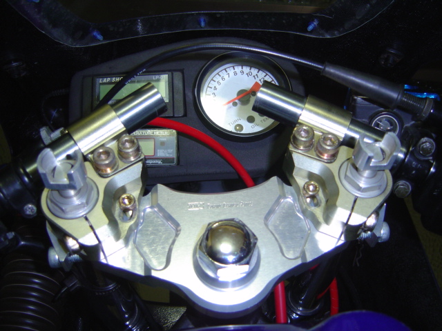 写真はマイバイクのコクピットですが先週交換したばかりのTTS製トップブリッジとハンドルホルダーが誇らしげに鎮座しています。その向こうに見えるメーターパネルは自作のモノですが左にラップショットと水温計、右にタコメーターが見えます。