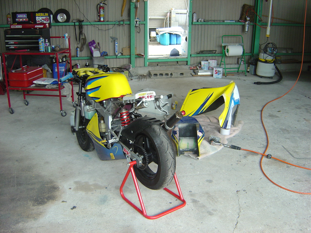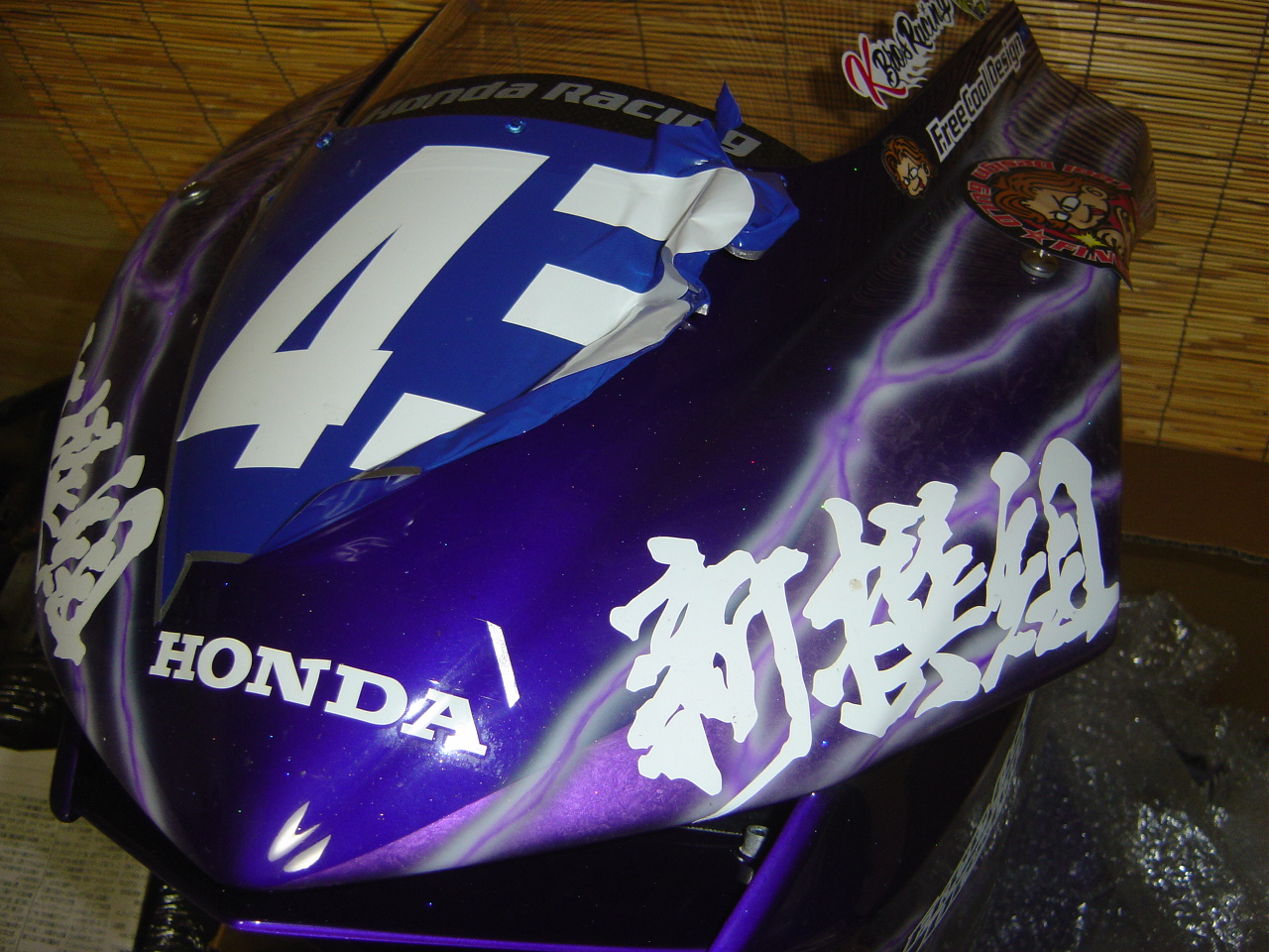 カウルの準備と言っても、先日行われたHSR九州3時間耐久レースに使用したカウルのゼッケン及びベースを剥がして洗います。只今、その最中なのですが中々ゼッケンがうまく剥がれませんネ。この後は中性洗剤を使ってスポンジで洗いますが前回のレースでオイルがアンダーカウル内に残っている為かなりメンドクサイです。洗浄後今回のレースに使用するゼッケンをカッティングシートから切り出して貼り付けます。結構メンドウな作業ですがバイクが綺麗になっていく姿がワタシは大好きですね。