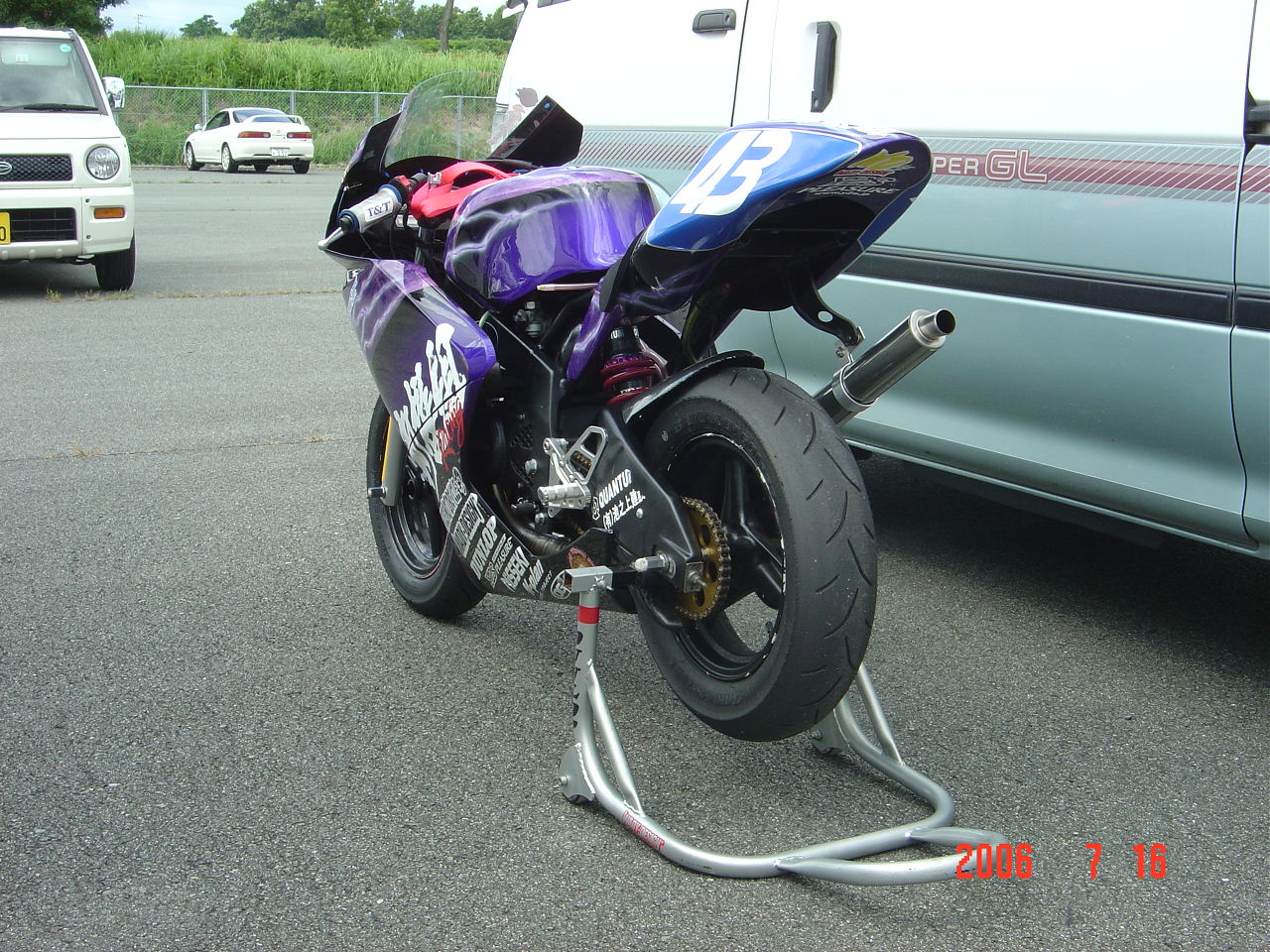 ですから前日の練習走行で全く話しにならなかった場合(決勝で周回遅れ確実な場合)翌日の決勝をMクラスに変更しようかな〜なんて考えています。その為のノーマルマフラーなんですよ。