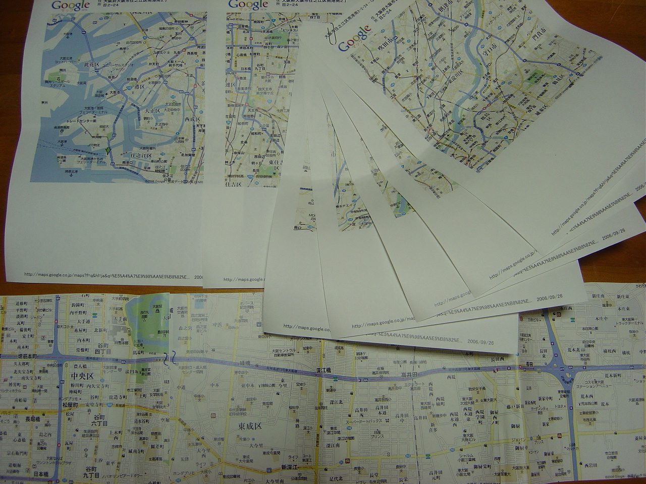 今日になって嫁が非常に気の利いた工作をしています。インターネットで地図をコピーし、切り取って繫いでいます。時代はカーナビ全盛ですが貧乏なワタシの家では究極のアナログ地図です。どこまで正確なのか非常に怪しいところですがホントに有難い限りです。コレを広げて関西へ上陸したいと思います。