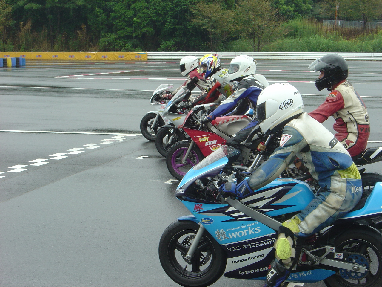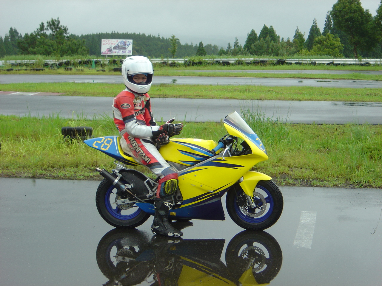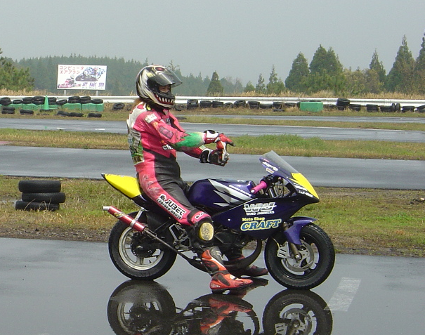 前日の練習で、ドライでのトップタイムに全然及ばないワタシ達の作戦は・・・ここドリームサーキットではレインタイヤの装着率が低いだろうという予想に基づいたもので、レインコンディションであれば良いレースが出来るでしょう〜!ってもの。サーキット到着後、既に到着しているスプリントライダーのマシンをチェック!フムフムみんなドライタイヤを装着しているようです。この時点でよっぽどのミスがなければ表彰台?な〜んて2人で顔を見合わせてニヤリ
