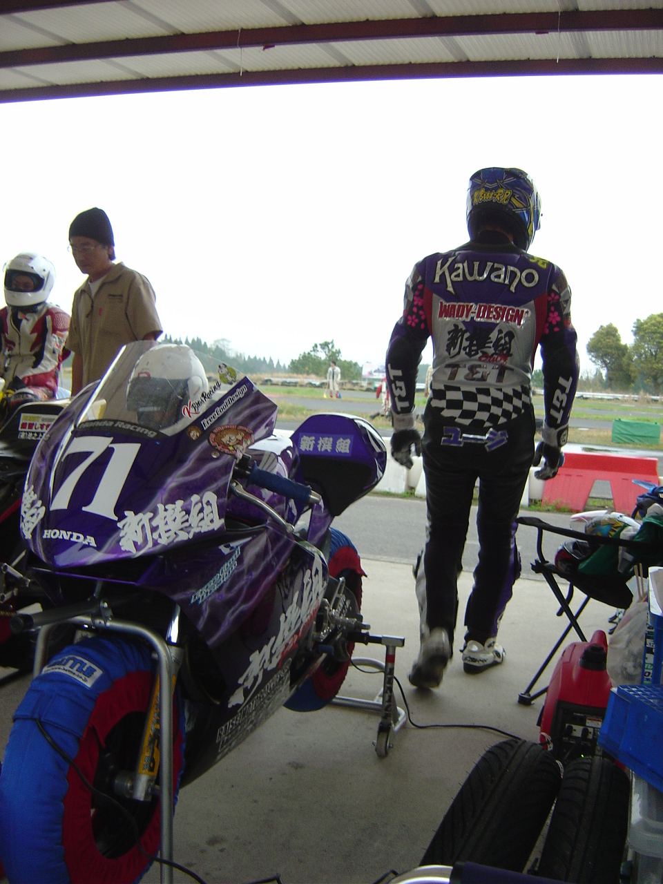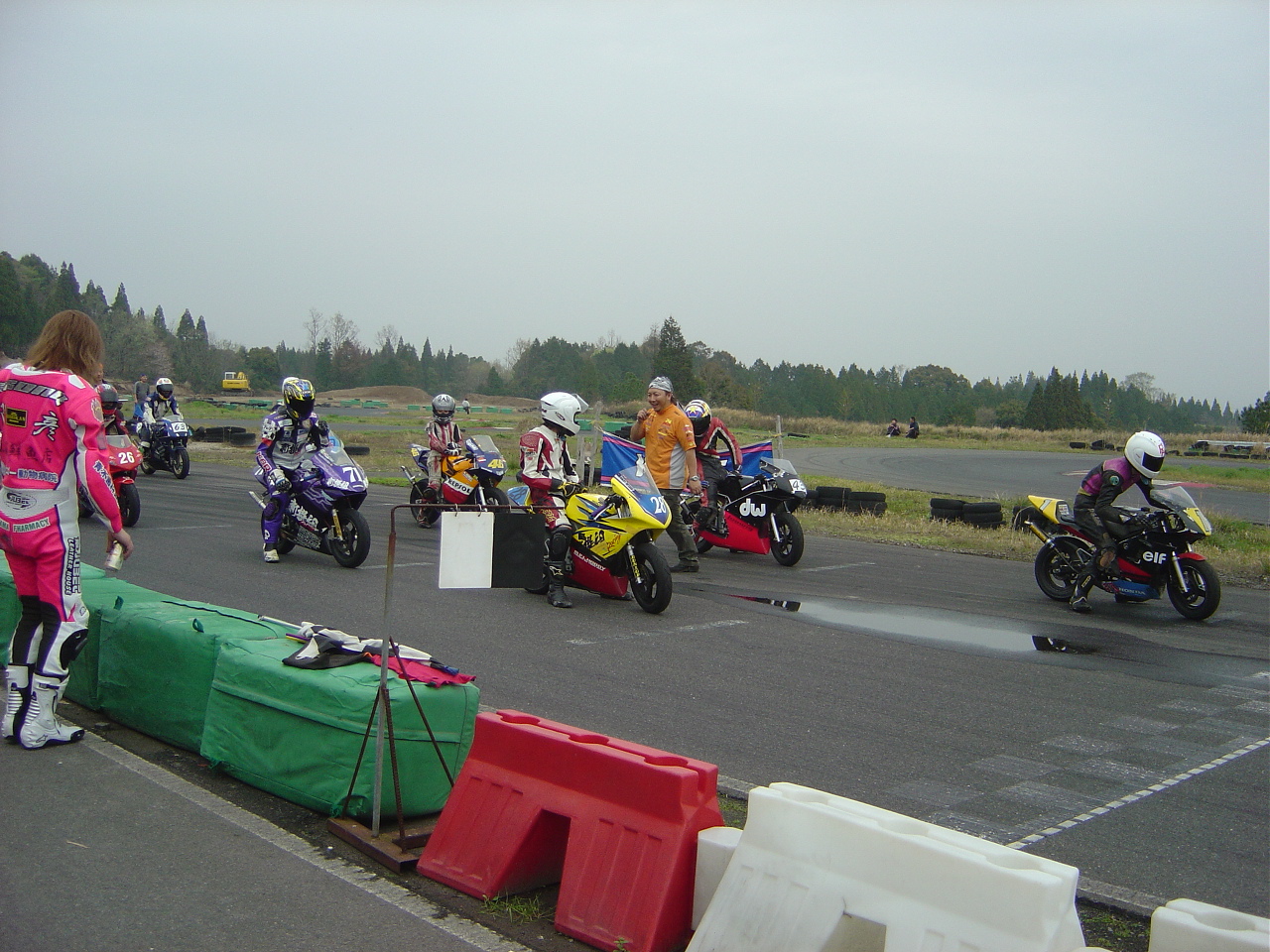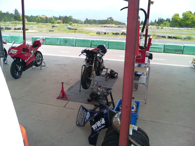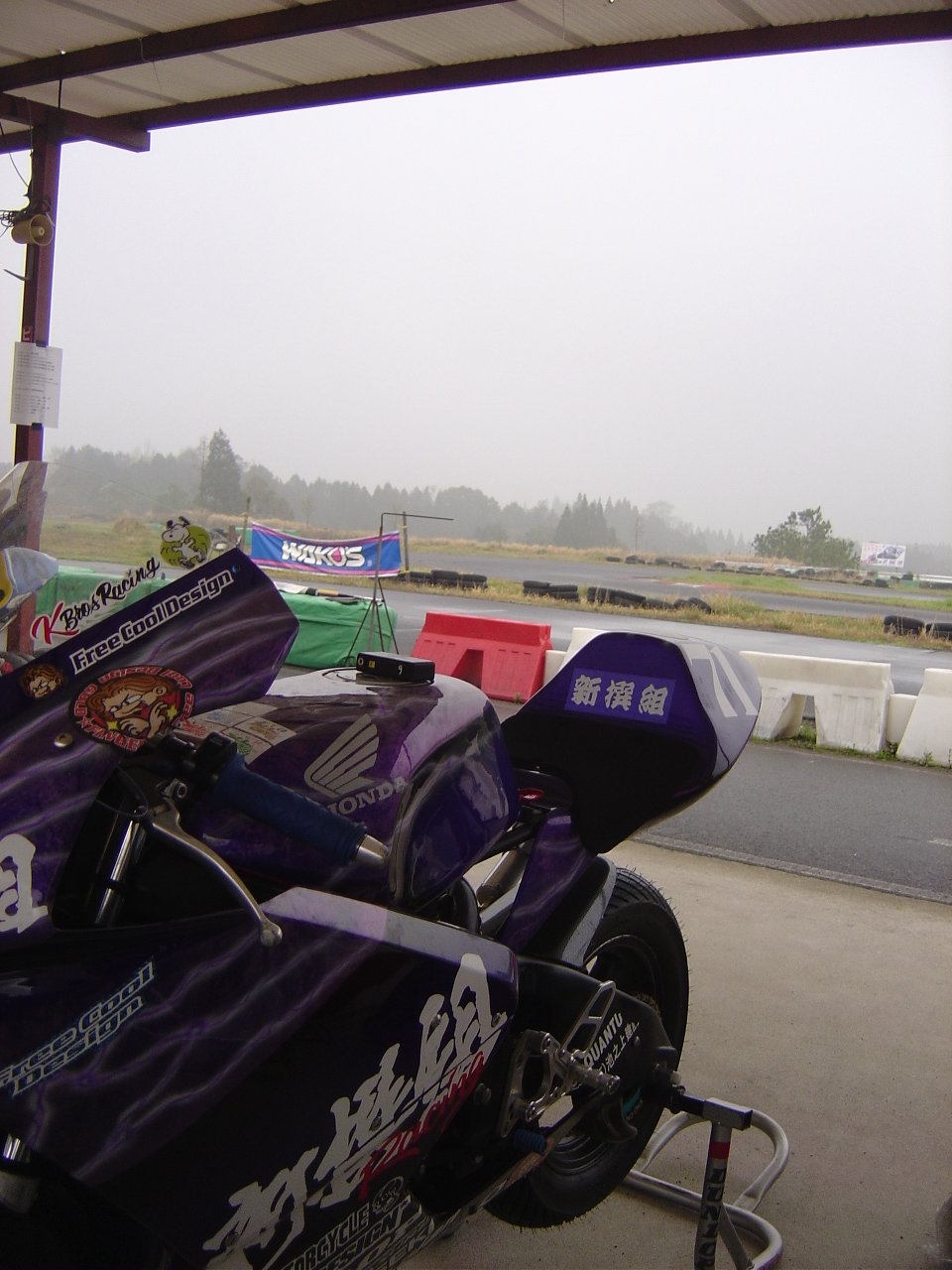 ん〜まさにHOBBYウェザーと呼べる不安定な天候の中、FRGP第2戦が行なわれました。前日からのAMEは朝方には止みパドックでは「今日は1日AME降らないらしいよ〜」とか「午後からAMEみたいヨ〜」とか「終日AMEじゃな〜い」なんて憶測が飛び交いピットに並べられたバイクはタイヤが決まらずライダーもおろおろ。。。