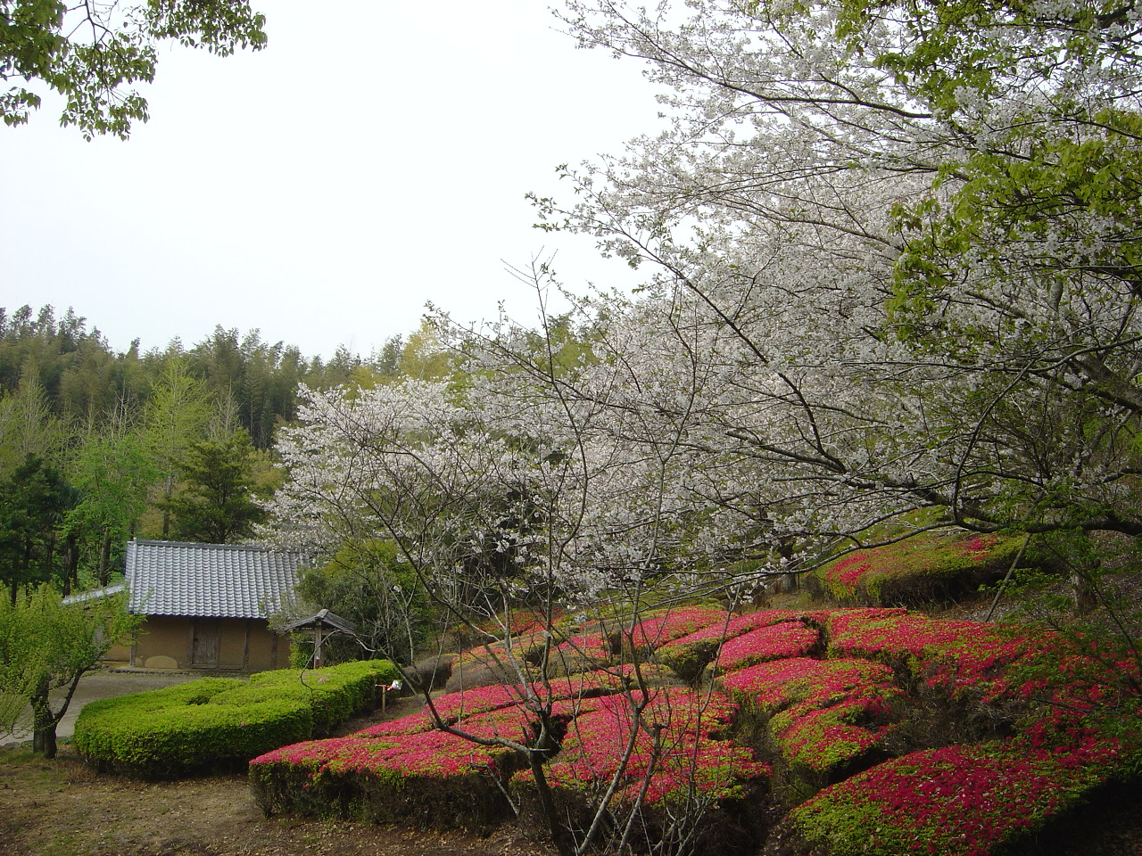 場所は同町内の公園、ココは毎年桜まつりの行なわれる地元では有名な場所です。サクラのピンクとツツジの赤、緑のコントラストがいいですね〜