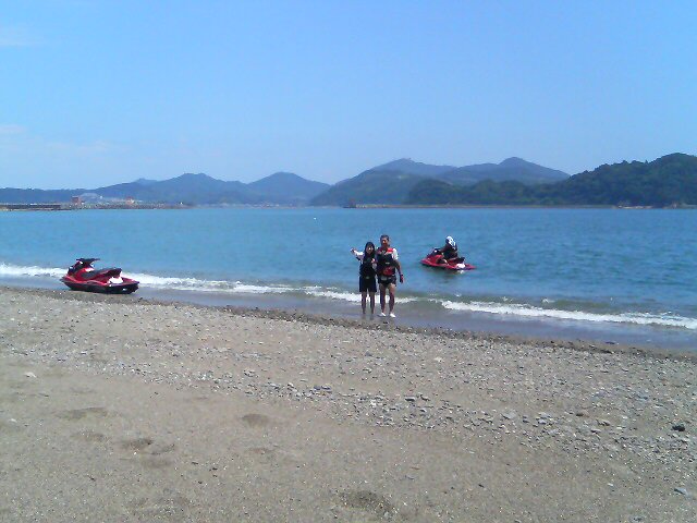さてさて今日は、いまいち気分の乗らないゴルフに引き続き新しいスポーツに挑戦!って事でジェットスキー。次長島耕作さんに連れられて行って来ました県北の某海岸。今回の参加者は、途中で待ち合わせたH隊長とその仲間達、次長島耕作、Mチャン、ワタシの9人。用意された車両?ジェット?は3人乗りの1500cc、3人乗りの1200cc、2人乗りの850ccの3台。見た事はあったものの、近くで見るとな〜んかデカくて、厳つい。