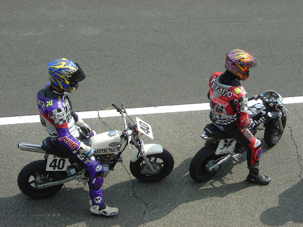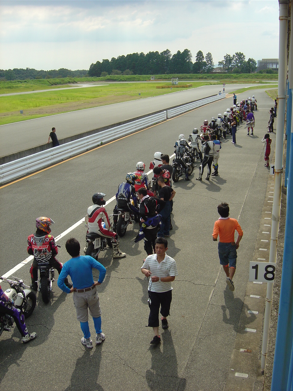 ところが、休憩が終わり「グリッドはスタート前チェックが済み、ピットレーンに並んだ順で〜す!」なんてアナウンスがあってから様子は一変しました。ザワザワとピットが慌しくなり、ガチャン!ガチャン!ってスタンドからバイクを降ろす音が鳴り始めます。BOKUさんもサスガに慌て始め、早く並ぼうよ!ってバイクを押して行ってしまいました。
