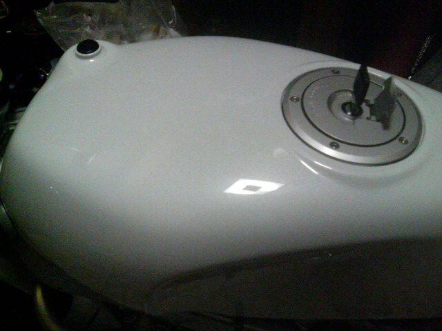 今度のカウルもパールホワイト単色でペイントしました。通常であれば「ちびのりくん」にペイントの依頼をするところですが、練習用のカウルだし、レース迄時間が無かったのでBros弟の知り合いの板金屋さんでペイントしました(ゴメンネ、ちびのりくん