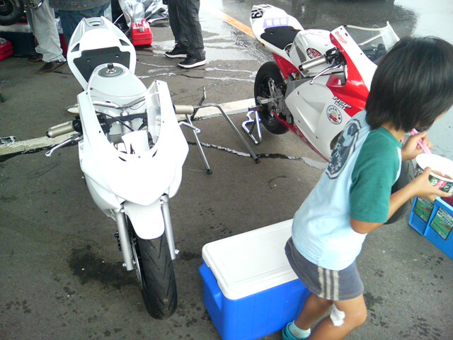 トランポを着けるところが無く、ピットの端っこにバイクを降ろす事になりました。工具や道具を降ろし、ちょっと食事でも・・・とカップラーメンの準備をしていると、ポツン ポツン ポツポツポツドザーって一気に土砂降りのAME