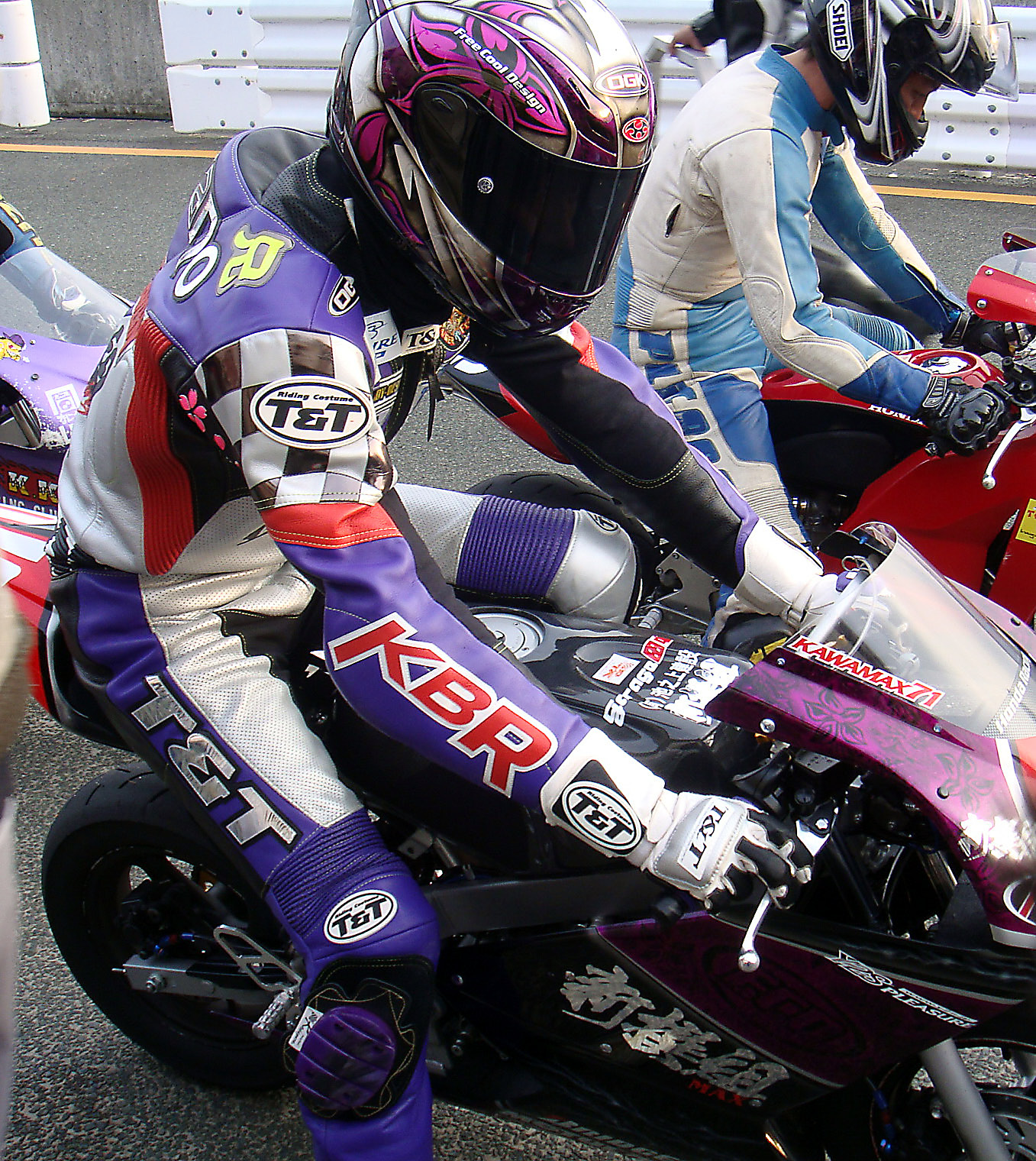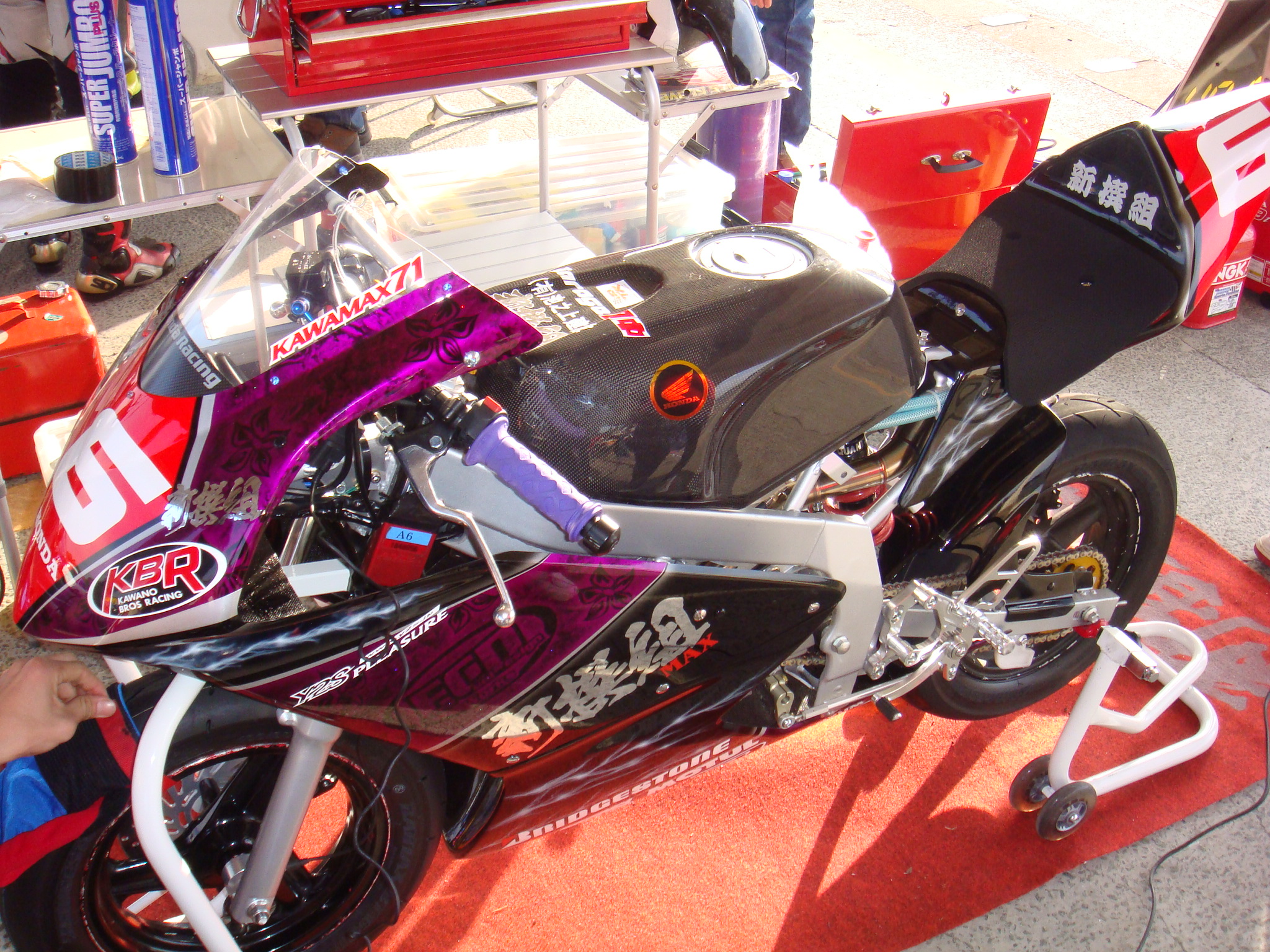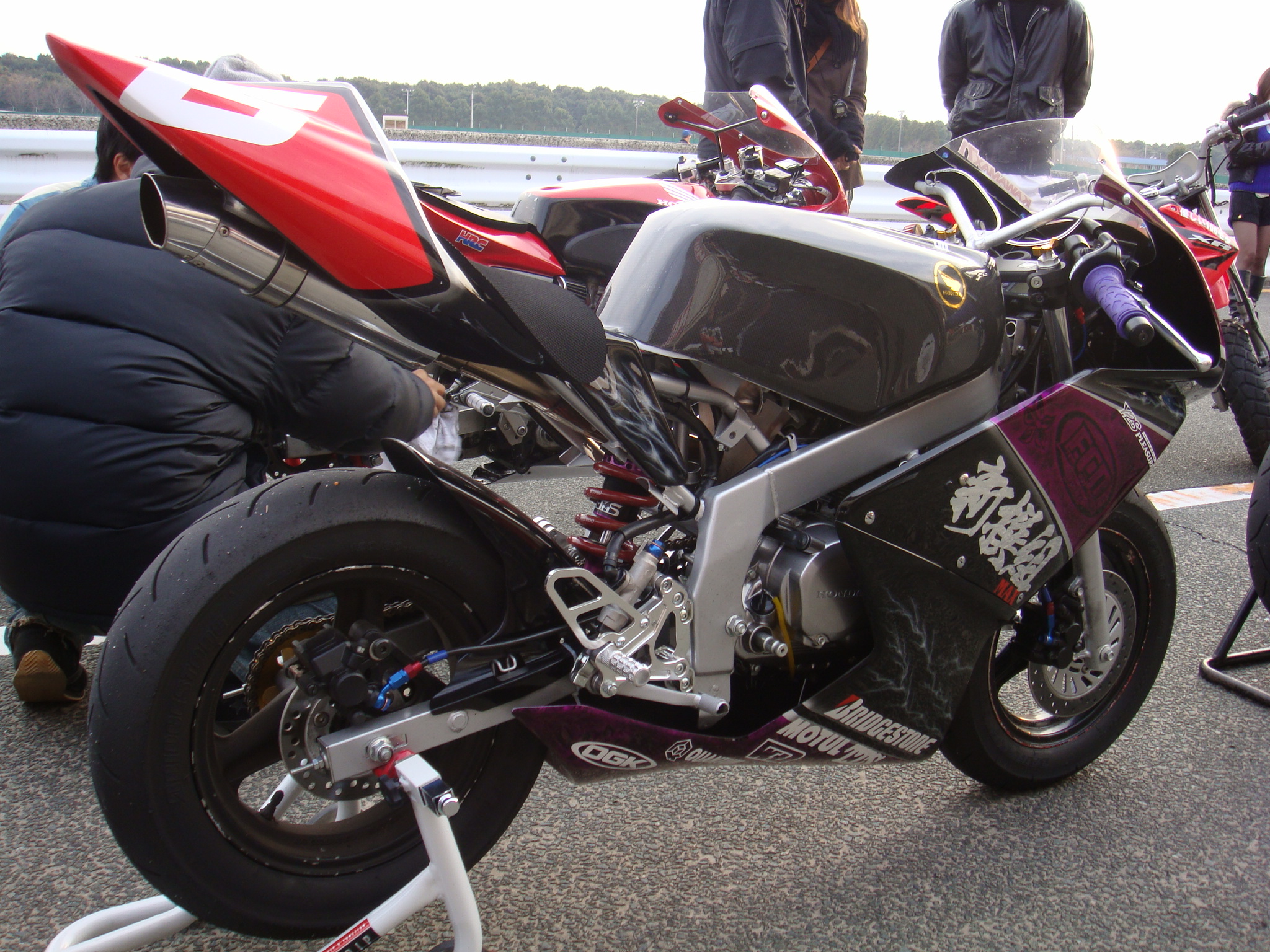 ワタシ達「新撰組+FCD+WD」チームはレース前日にサーキット入り、25分の走行枠を2本、1時間の練習走行時間を存分に使い、バイクのセットや練習を行ないました。今回の作戦は、前日練習で一番乗れているライダーに当日の予選時間15分を全部与え、タイムアタックをしてもらう、残りの2人が練習時間を使って、予選の為にフレッシュタイヤの皮むきと各部の最終調整を行なうというものです。