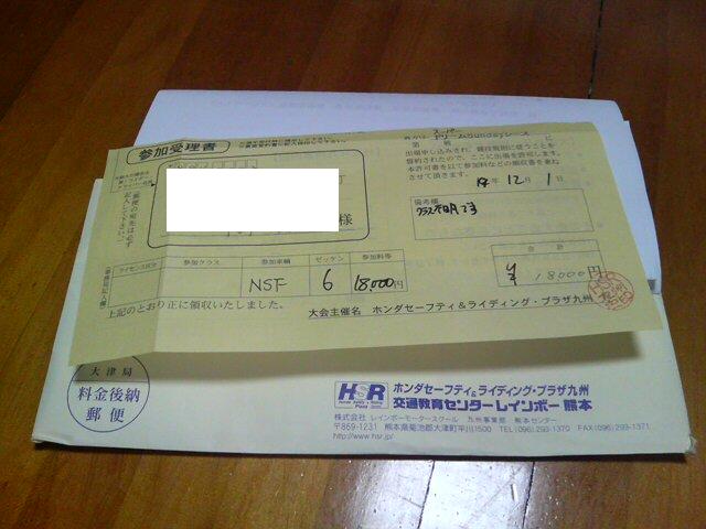 昨日、参加受理書が届きました。いつもの事ですが、コレが届くとレースが近付いて来たな〜って感じます。今回はエントリーが早かったせいか、ゼッケンが一桁の「6」です。玉田選手の「6」というか、ノリックの「6」というか。。。いえいえAMEさんの「6」だなコリャ