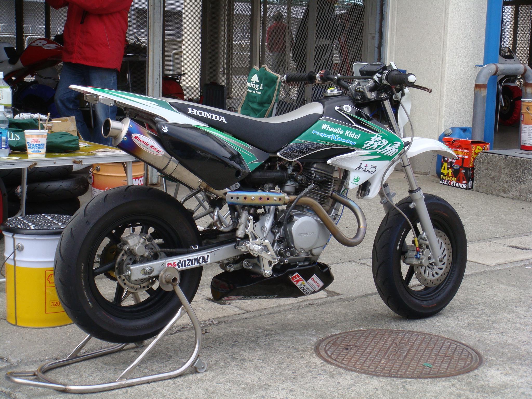 先日のAP公式練習で隣の隣に陣取っていた方のXR−stです。オリジナルデカールでデコレーションされた車両がとてもカッコ良くてコッソリ盗撮してしまいました。グリーンとブラック、そしてホワイトのバランスがとても上品で都会的でしたね。このまま純正色として販売されていても不思議ではないくらい。。。