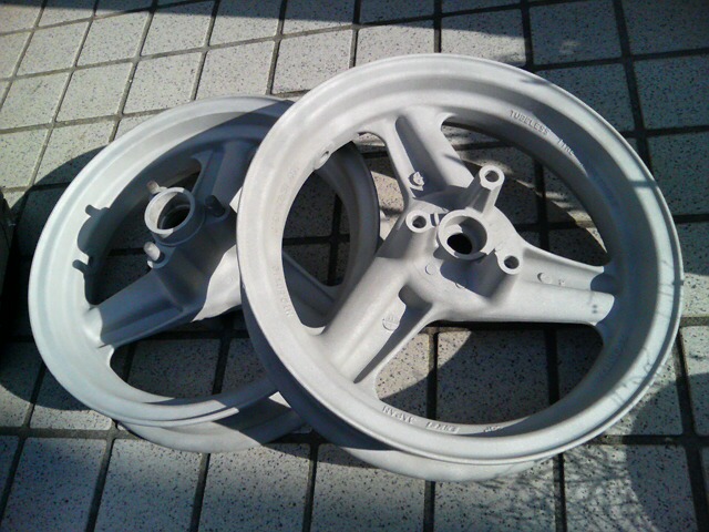 知り合いのトコロにサンドブラストを依頼していたホイールが戻って来ました。元々ミドリ色に塗られたヘンテコな前期ホイール