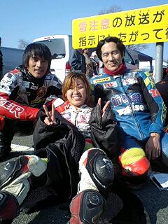 彼女がミニバイクでレースをしている時から応援していたのですが、今回ナンと同じレースに参戦するってことで予選日のブリーフィング時に写真を撮りました。っていうか勝手に貰って来ました。。。ゴメンナサイ大阪からの遠征で知人と彼氏と3人で組んだM12クラス。(画像は左からBros弟、奈緒子選手、Bros兄)