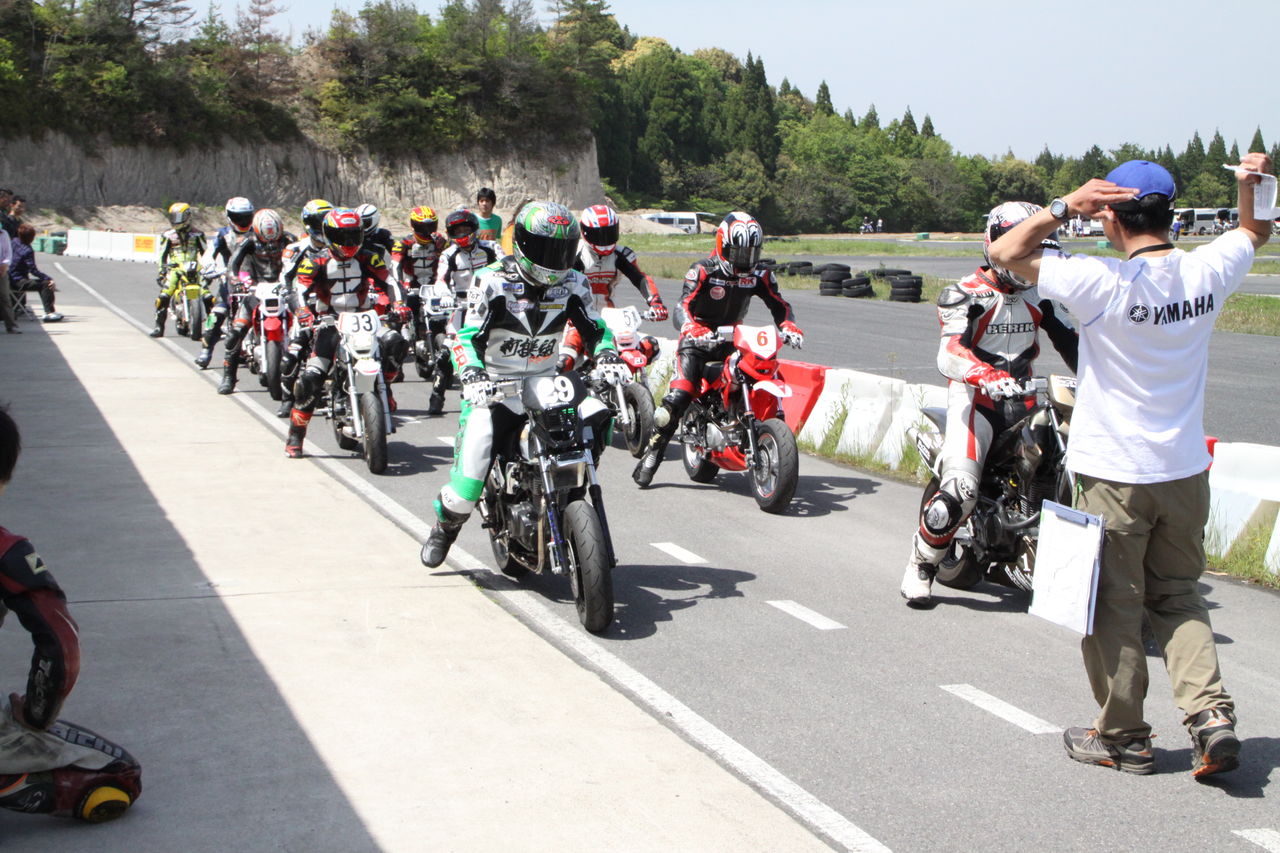 一斉にスタートした集団は、少々ぶつかりながら1コーナー、2コーナーの大渋滞を走り、2つ、3つの集団となり、各集団での熾烈な抜き差しを繰り返します。見所十分ですが、ヒヤヒヤする場面も。。。今回も単独での転倒、ライダーが宙を舞う様な激しい転倒もありました。