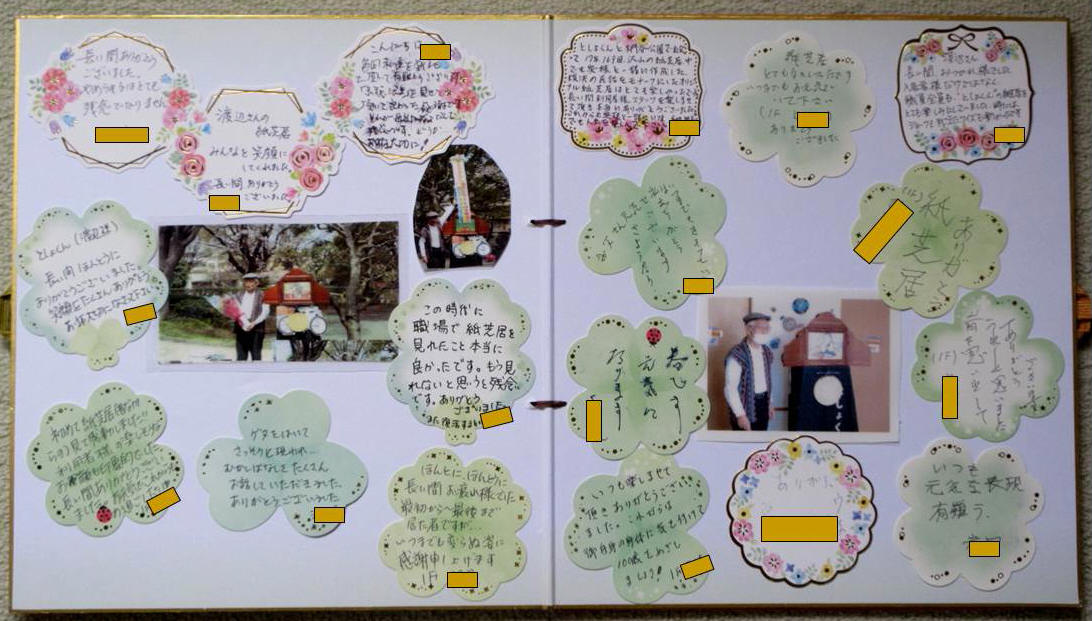 紙芝居ボランティアを始めて1番最初に伺い その後毎月の様に伺い 17年8ヵ月 総計168回の訪問をしました 『愛の郷グループホーム』さんの方が 自宅においでになり 「長い間お世話になりました・・・・」との事で 身に余るプレゼントを頂きましたその中の一つ『寄せ書き』には 愛の郷グループホームのスタッフの皆さんや 入所の皆さんからの嬉しい言葉が書かれていました 中には第1回目から ずーーっとお付き合いくださった方も・・・・