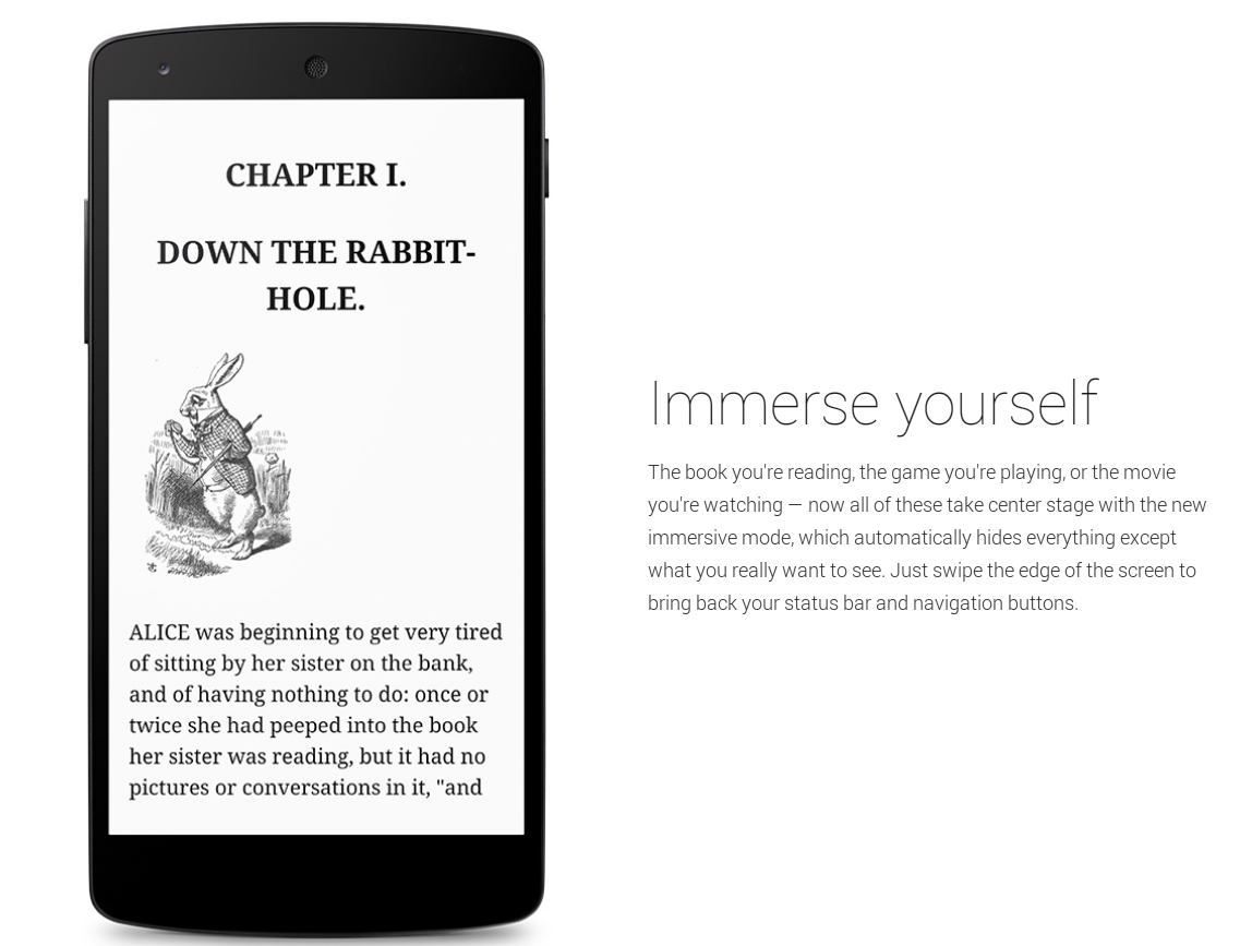 あなたが本を読んでいる時、あなたがゲームで遊んでいる時、映画を見ている時、全画面にすることが可能です。ステータスバーとナビゲーションバーを戻すには、画面の端をスワイプするだけです。"