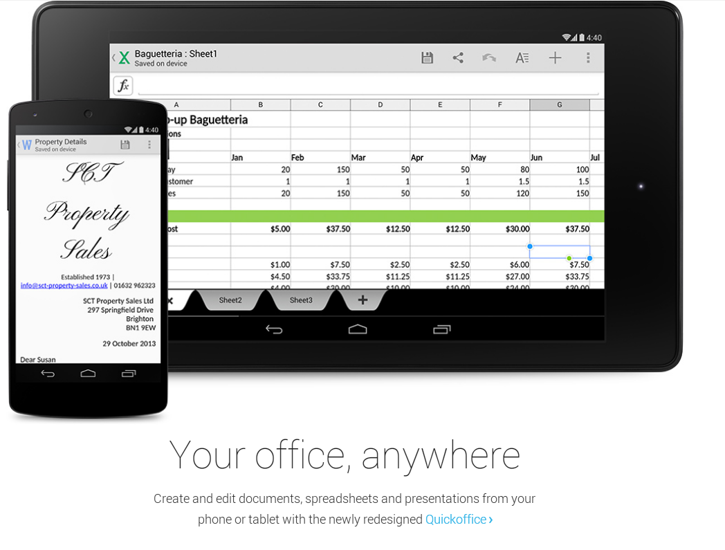 新たに再設計されたQuickofficeで、お使いの携帯電話またはタブレットからの文書、スプレッドシート、プレゼンテーションの作成 と編集ができます。"