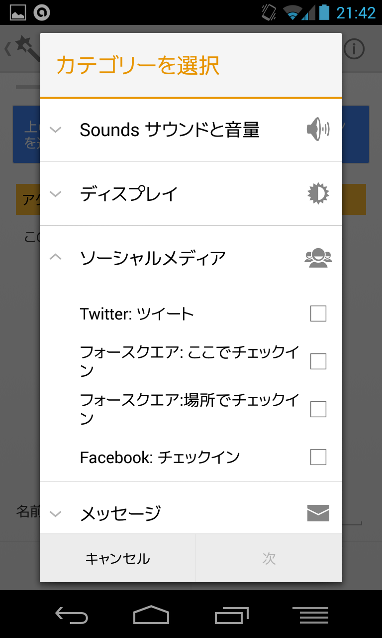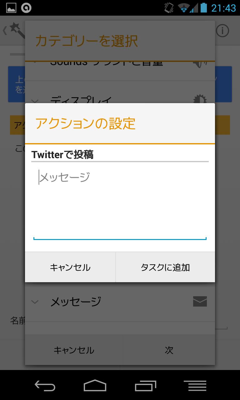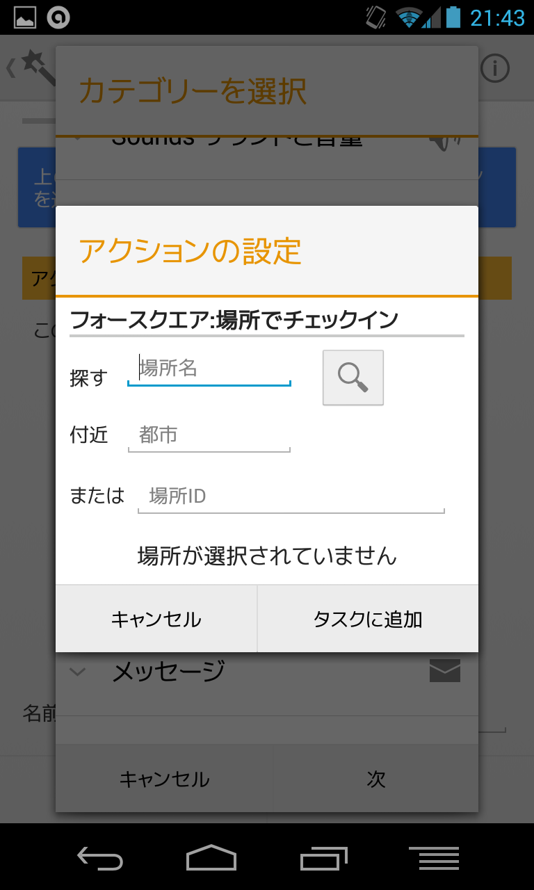 設定タスクにて上の+ボタンを押すと、色々な動作を設定できます。上で表示しているのは一部ですが、Twitterへ自動投稿したり(初回時に認証が必要です) 、フォースクエアでチェックインする動作も簡単に設定することができます。自動でメールを送信したりもできるんですね…