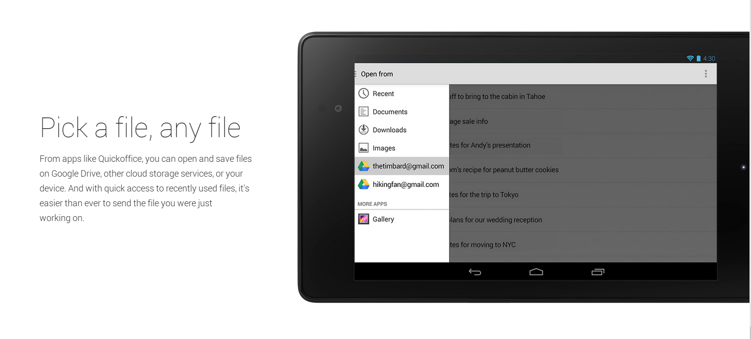 Quickofficeのようなアプリケーションで、Googleドライブ、他のクラウド·ストレージ·サービス、またはデバイス上のファイルを開いたり保存することができます。と最近使用したファイルへの迅速なアクセスと、それはあなただけで作業していたファイルを送信するためにこれまで以上に簡単です。"