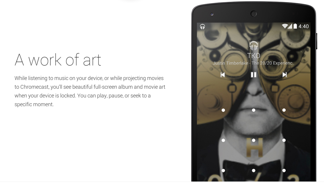 あなたのデバイス上で音楽を聴きながら…またはChromecastに映画を投影しながら、あなたのデバイスがロックされている状態で、美しいフルスクリーンのアルバムや映画芸術を見ることができます。あなたは、再生、一時停止、を好きなときにすることができます。"