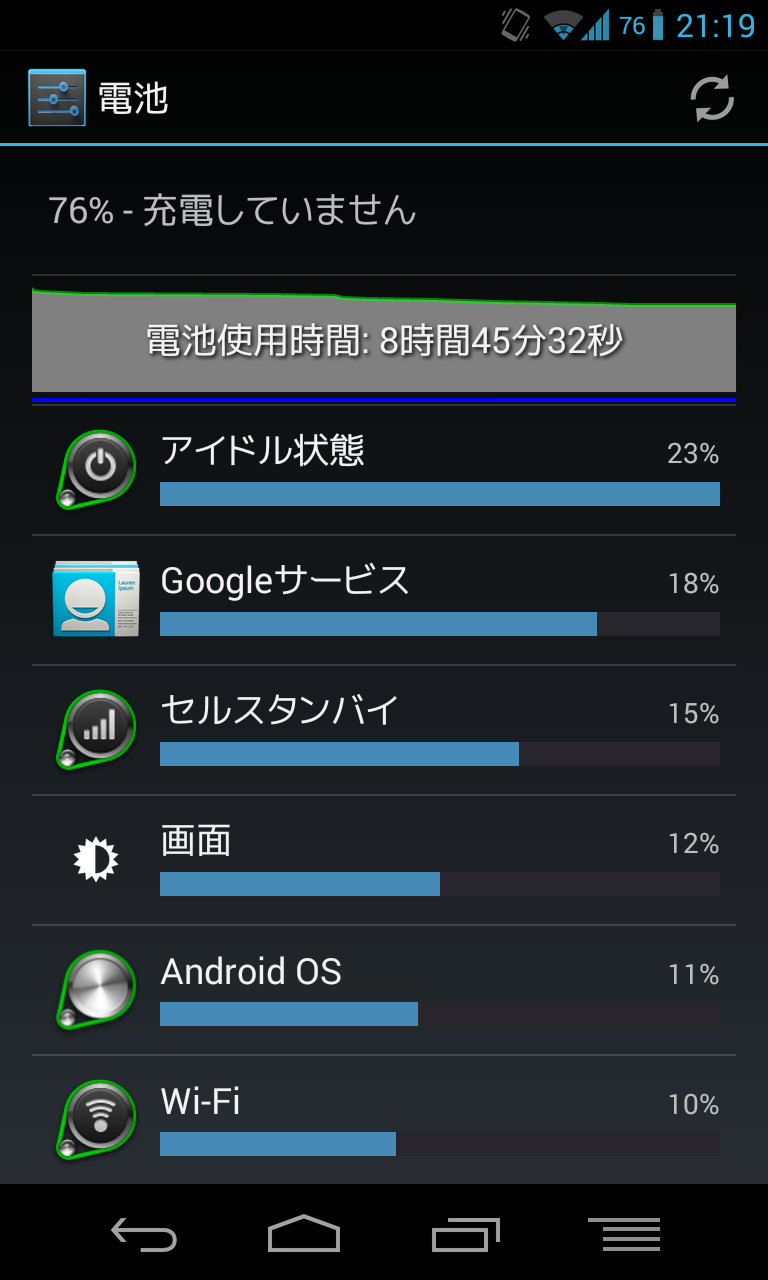 8時間45分放置して残量76%です。1.6%/hといったところでしょうか。悪くないパフォーマンスですね。