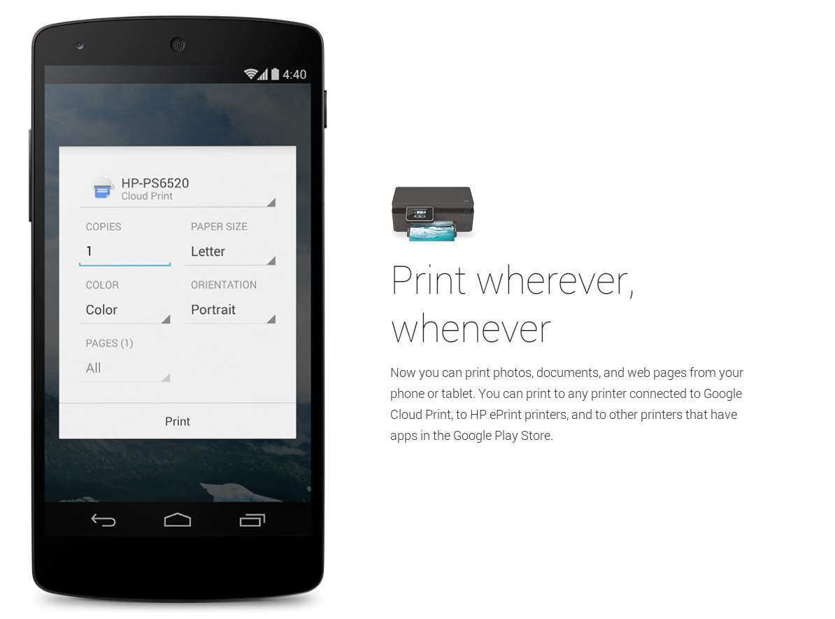 今、あなたの携帯電話またはタブレットからの写真、ドキュメント、Webページを印刷することができます。あなたは、HP ePrintのプリンタに、Googleクラウドプリントに接続された任意のプリンタに、そしてGoogleプレイストアでアプリを持っている他のプリンタに印刷することができます。"