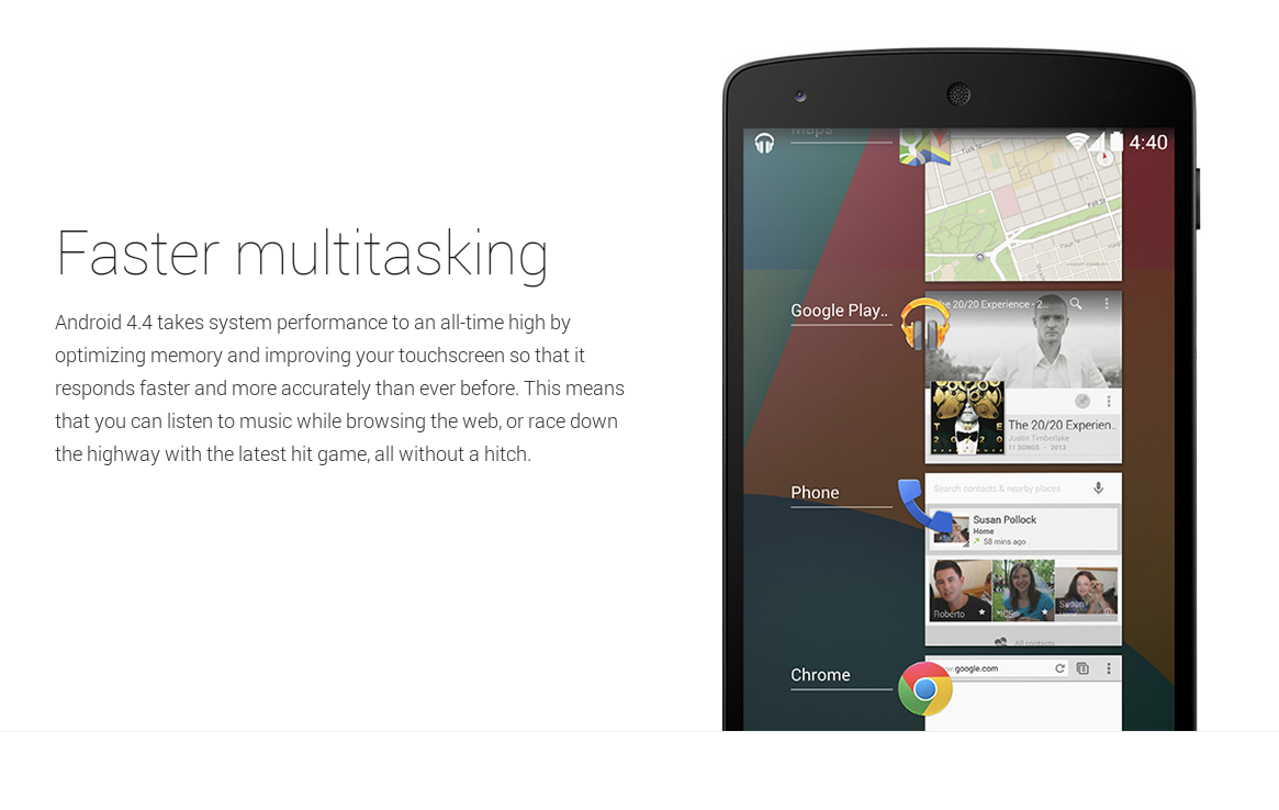 Android4.4は、より速く、より正確にはこれまで以上に応答するように、メモリを最適化し、あなたのタッチを改善することにより、過去最高のシステムのパフォーマンスを得ました。これは、Webを閲覧しているときに音楽を聴くことができることを意味したり、最新のゲームで高速道路をレースしている時もです。"