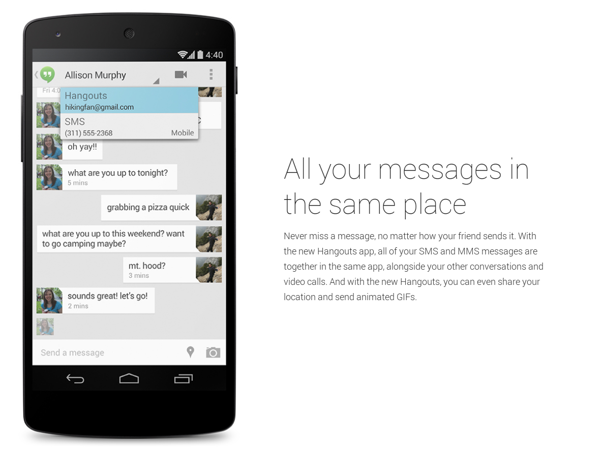 あなたの友人がメッセージを送信する方法に関係なく、メッセージを見逃すことはありません。新しいたまり場のアプリで、あなたのSMSとMMSメッセージのすべてはあなたの他の会話やビデオ通話と一緒に、同じアプリにされています。そして新しいたまり場で、あなたもあなたの場所を共有し、アニメーションGIFを送ることができます。"