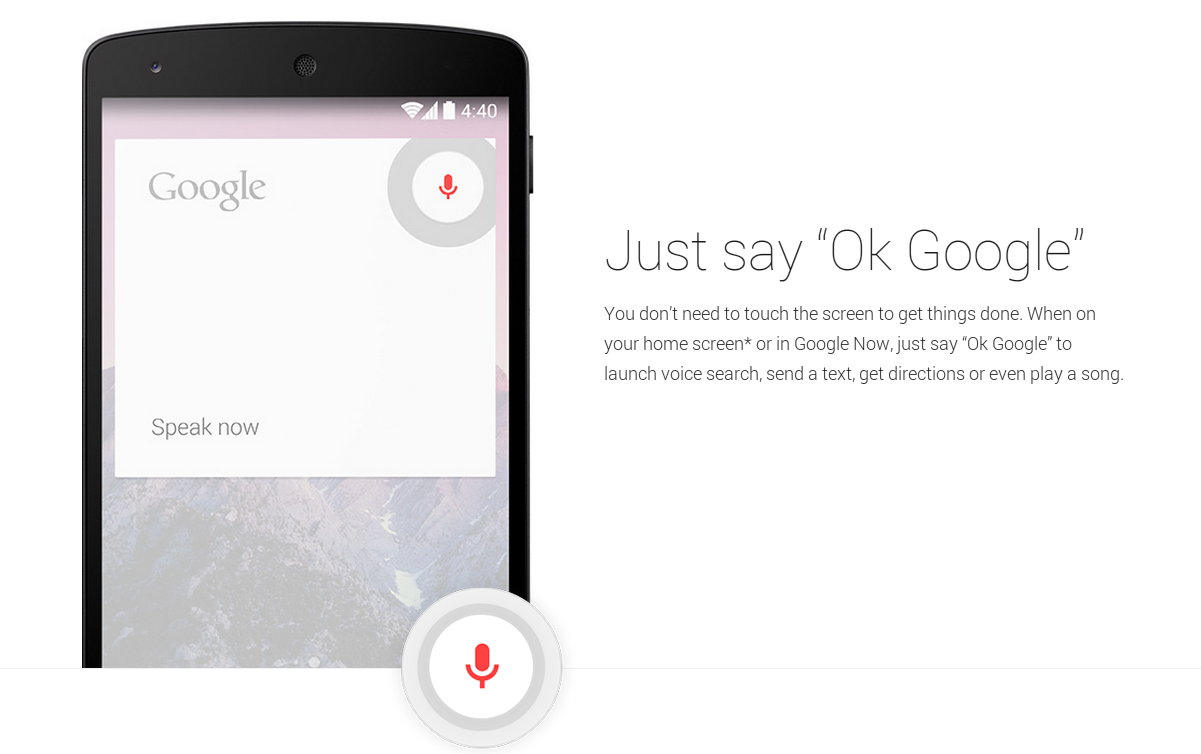 あなたが物事を成し遂げるには、画面をタッチする必要はありません。ホーム画面にいる時や、Google nowを起動している時、「Ok Google」と言うだけで音声検索が起動します。テキストを送信したり、道順を取得したり、曲を再生したりできます。"