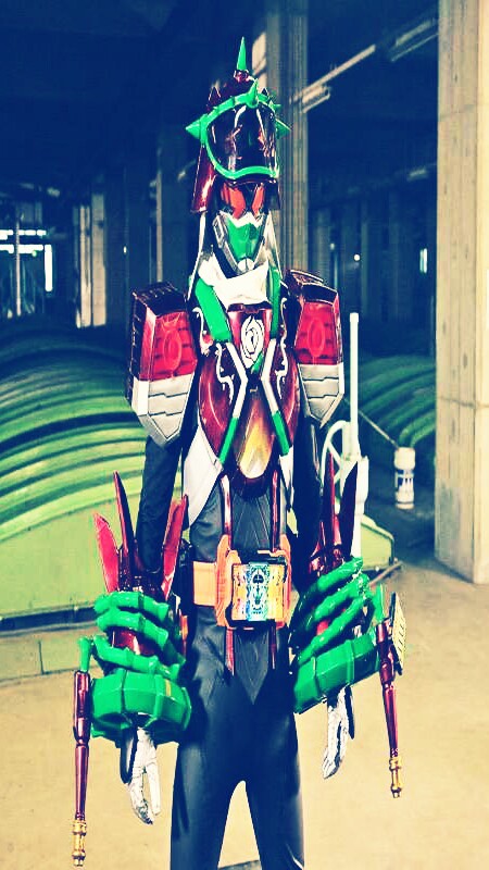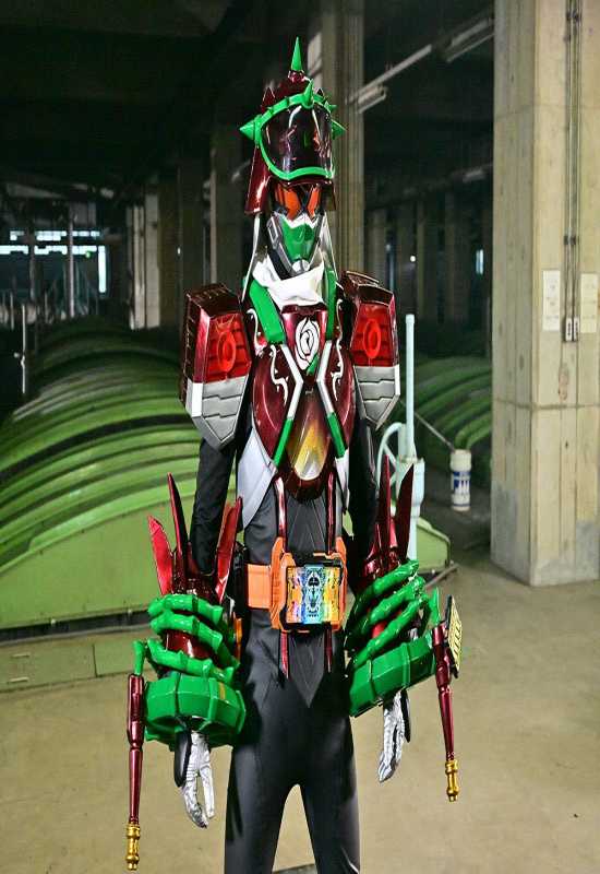赤と緑がイメージカラーの新フォームに変身した時の仮面ライダーガッチャードの写真