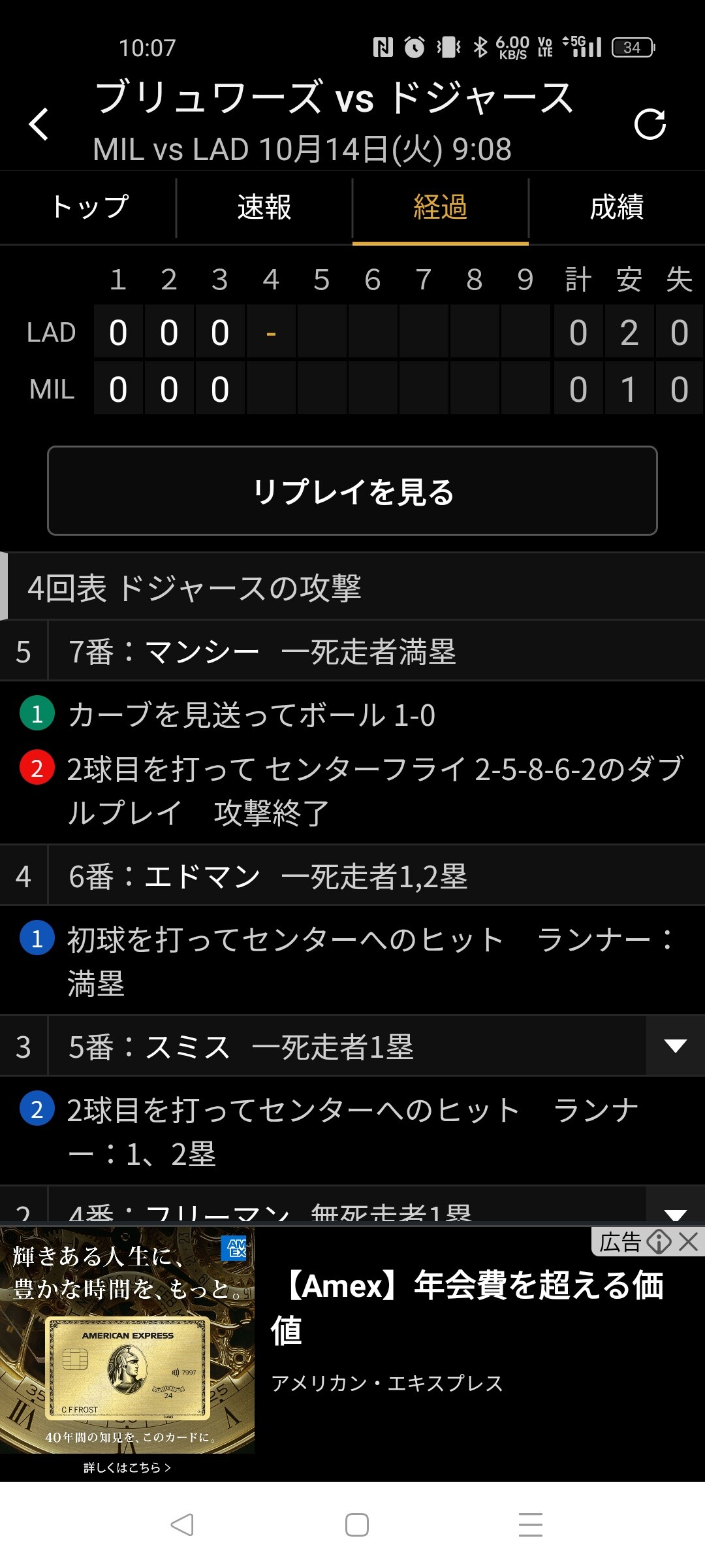 両軍無得点の4回、ドジャースは1死満塁からマンシーが中堅後方へ大飛球を放った。中堅手フリリックがフェンス際でジャンプして一度グラブに収めるも、弾いて地面につく前に再捕球。しかし、再捕球の前にフェンスにボールが当たっていた。