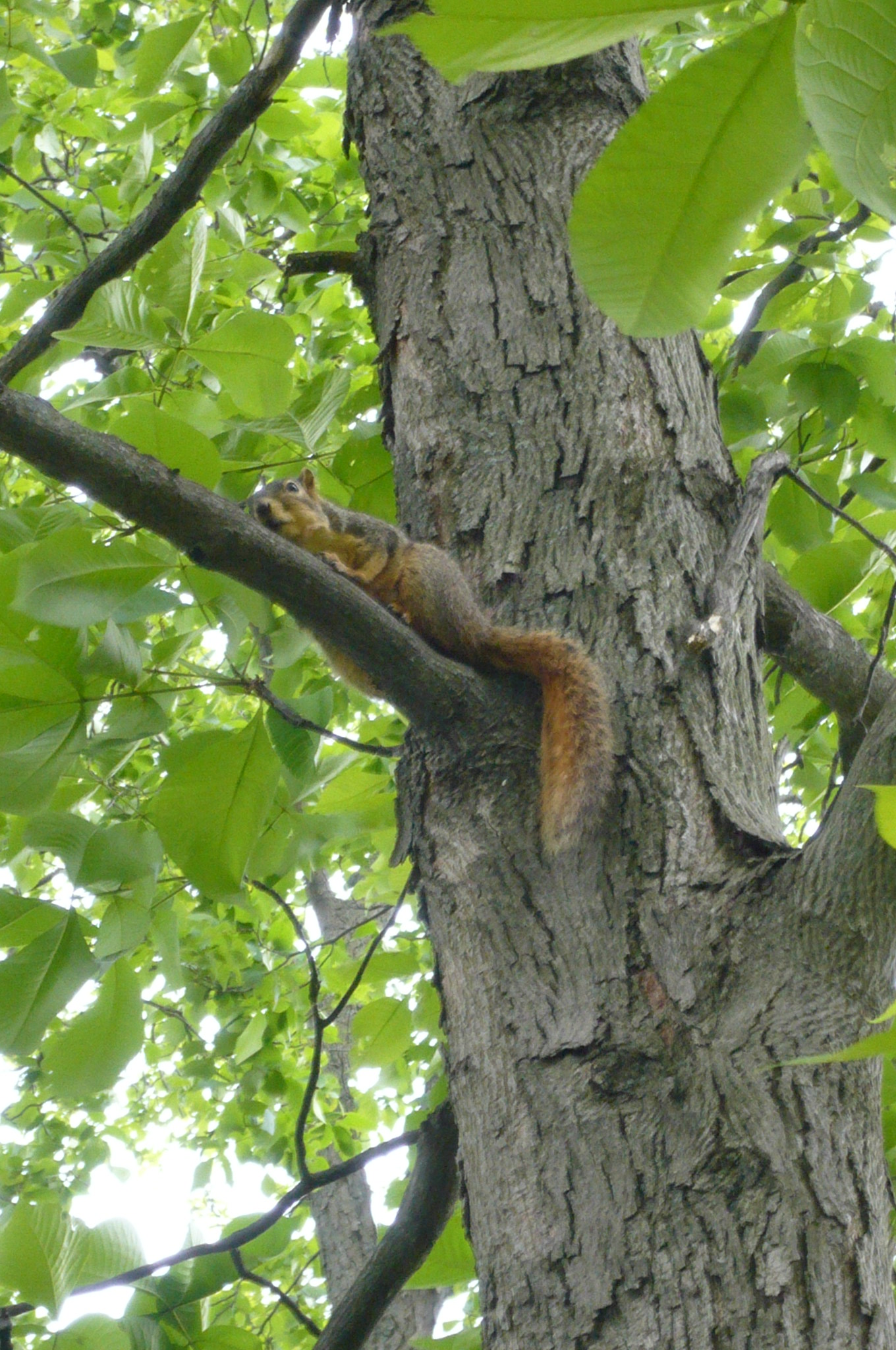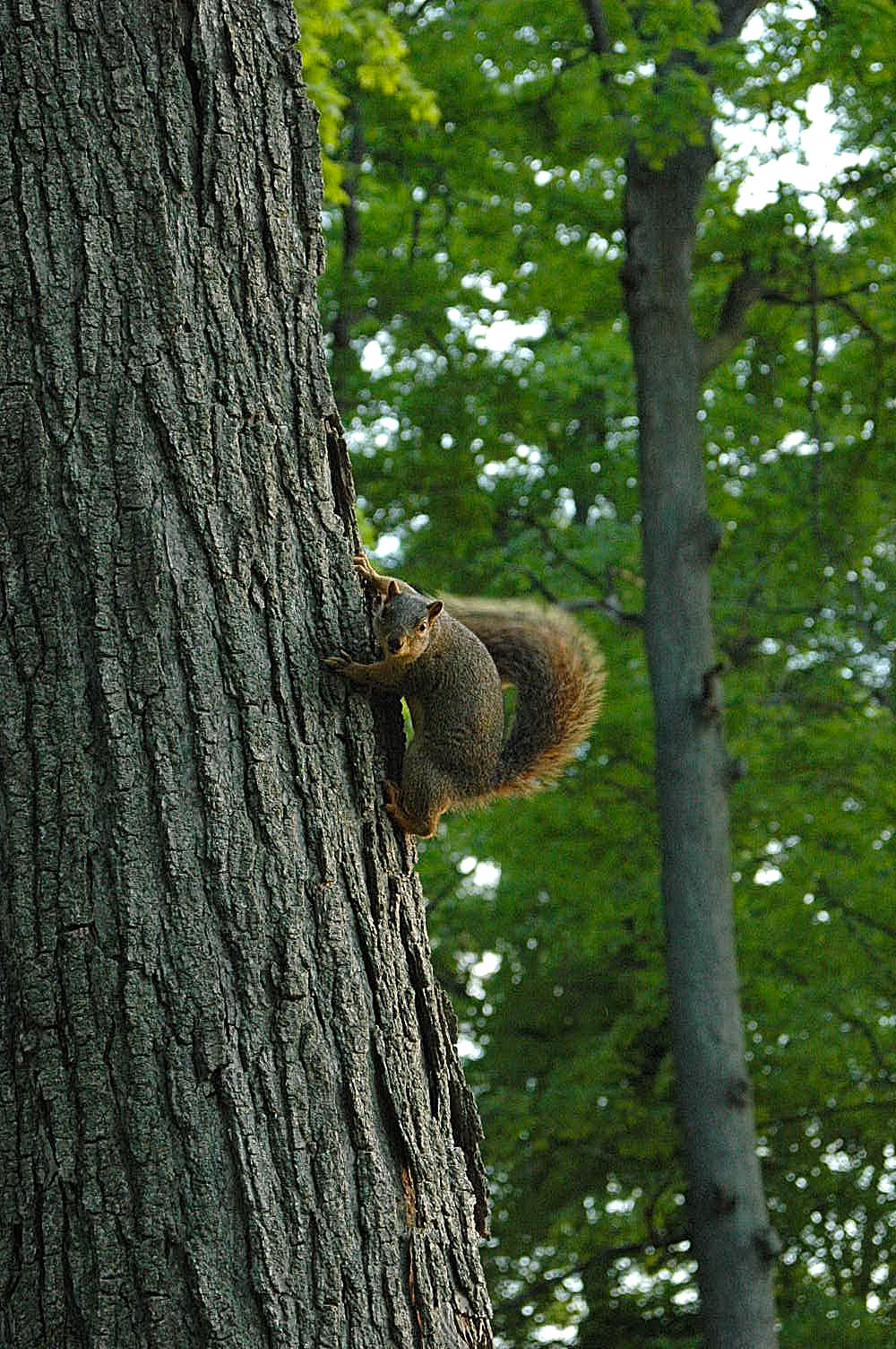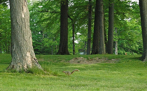 今日は、ひそかに「リスの森」と呼ぶリス多発地帯へお散歩へ出かけましたー。緑がまぶしい森の中で目を凝らして見ると……。いたいたいた!!高速移動中のリス発見です!!