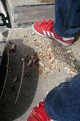 (右)この森には、この時期メイプル(カエデ)の種が沢山落ちてるので、日中はリスがウヨウヨいるそうな。足元を見ると、こんな感じ(右写真)で種子の部分がかじられたカスが沢山落ちてます。