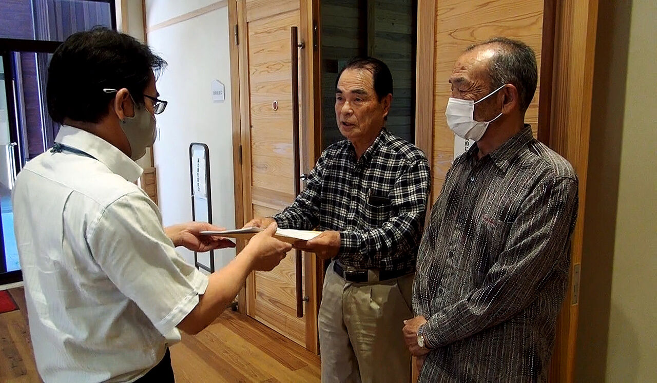 住民監査請求書を町監査委員事務局長(左)に手渡す小脇清保氏ら(2022年5月9日、屋久島町役場議会棟)